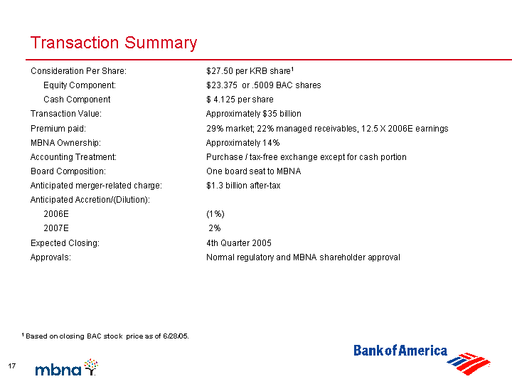 | Transaction Summary Consideration Per Share: $27.50 per KRB share1 Equity Component: $23.375 or .5009 BAC shares Cash Component $ 4.125 per share Transaction Value: Approximately $35 billion Premium paid: 29% market; 22% managed receivables, 12.5 X 2006E earnings MBNA Ownership: Approximately 14% Accounting Treatment: Purchase / tax-free exchange except for cash portion Board Composition: One board seat to MBNA Anticipated merger-related charge: $1.3 billion after-tax Anticipated Accretion/(Dilution): 2006E (1%) 2007E 2% Expected Closing: 4th Quarter 2005 Approvals: Normal regulatory and MBNA shareholder approval 1 Based on closing BAC stock price as of 6/28/05. |