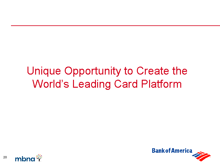 | Forward Looking Statements Additional Information About This Transaction Bank of America Corporation will file a Form S-4, MBNA will file a Proxy Statement and both companies will file other relevant documents regarding this transaction with the Securities and Exchange Commission (the "SEC"). MBNA will mail the Proxy Statement/Prospectus to its stockholders. These documents will contain important information about the transaction, and Bank of America and MBNA urge you to read these documents when they become available. You may obtain copies of all documents filed with the SEC regarding this transaction, free of charge, at the SEC's website (www.sec.gov). You may also obtain these documents, free of charge, from Bank of America's website (www.bankofamerica.com) under the tab "About Bank of America" and then under the heading "investor Relations" and then under the item "Complete SEC Documents". You may also obtain these documents, free of charge, from MBNA's website (www.MBNA.com) under the tab "About MBNA" and then under the heading "Investor Relations" and then under the item "SEC Filings." |