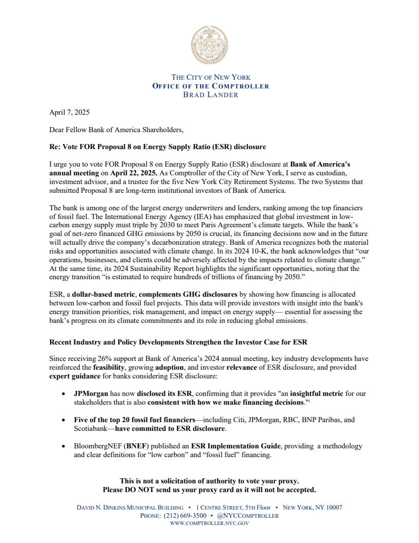 THE CITY OF NEW YORK OFFICE OF THE COMPTROLLER BRAD LANDER This is not a solicitation of authority to vote your proxy. Please DO NOT send us your proxy card as it will not be accepted. DAVID N. DINKINS MUNICIPAL BUILDING ? 1 CENTRE STREET, 5TH Floor ? NEW YORK, NY 10007 PHONE: (212) 669-3500 ? @NYCCOMPTROLLER WWW.COMPTROLLER.NYC.GOV April 7, 2025 Dear Fellow Bank of America Shareholders, Re: Vote FOR Proposal 8 on Energy Supply Ratio (ESR) disclosure I urge you to vote FOR Proposal 8 on Energy Supply Ratio (ESR) disclosure at Bank of America's annual meeting on April 22, 2025. As Comptroller of the City of New York, I serve as custodian, investment advisor, and a trustee for the five New York City Retirement Systems. The two Systems that submitted Proposal 8 are long-term institutional investors of Bank of America. The bank is among one of the largest energy underwriters and lenders, ranking among the top financiers of fossil fuel. The International Energy Agency (IEA) has emphasized that global investment in low-carbon energy supply must triple by 2030 to meet Paris Agreement's climate targets. While the bank's goal of net-zero financed GHG emissions by 2050 is crucial, its financing decisions now and in the future will actually drive the company's decarbonization strategy. Bank of America recognizes both the material risks and opportunities associated with climate change. In its 2024 10-K, the bank acknowledges that "our operations, businesses, and clients could be adversely affected by the impacts related to climate change." At the same time, its 2024 Sustainability Report highlights the significant opportunities, noting that the energy transition "is estimated to require hundreds of trillions of financing by 2050." ESR, a dollar-based metric, complements GHG disclosures by showing how financing is allocated between low-carbon and fossil fuel projects. This data will provide investors with insight into the bank's energy transition priorities, risk management, and impact on energy supply? essential for assessing the bank's progress on its climate commitments and its role in reducing global emissions. Recent Industry and Policy Developments Strengthen the Investor Case for ESR Since receiving 26% support at Bank of America's 2024 annual meeting, key industry developments have reinforced the feasibility, growing adoption, and investor relevance of ESR disclosure, and provided expert guidance for banks considering ESR disclosure: ? JPMorgan has now disclosed its ESR, confirming that it provides "an insightful metric for our stakeholders that is also consistent with how we make financing decisions."i ? Five of the top 20 fossil fuel financiers?including Citi, JPMorgan, RBC, BNP Paribas, and Scotiabank?have committed to ESR disclosure. ? BloombergNEF (BNEF) published an ESR Implementation Guide, providing a methodology and clear definitions for "low carbon" and "fossil fuel" financing.