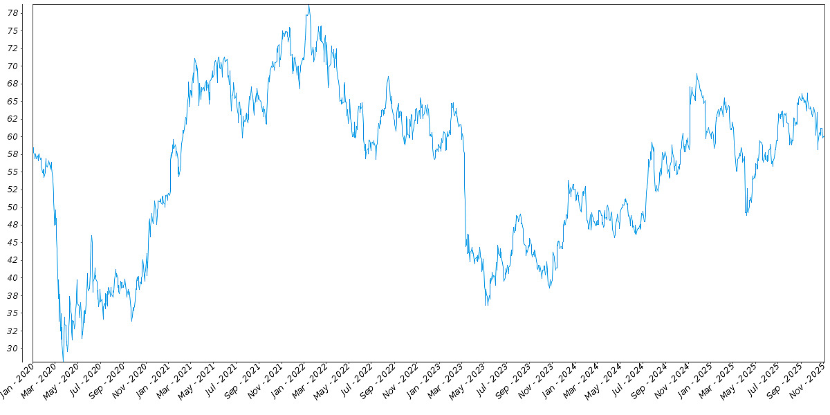 The following graph sets forth the daily historical performance of the KRE in the period from January 2, 2020 through November 3, 2025. We obtained this historical data from Bloomberg L.P. We have not independently verified the accuracy or completeness of the information obtained from Bloomberg L.P. On November 3, 2025, the Closing Market Price of the KRE was $60.14.