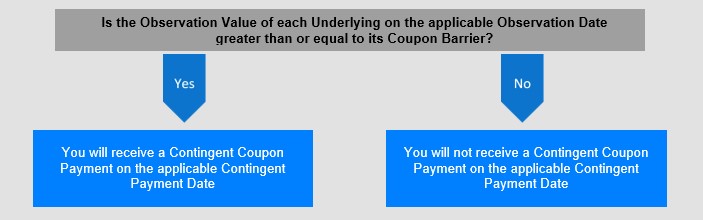 If, on any quarterly Observation Date, the Observation Value of each Underlying is greater than or equal to its Coupon Barrier, we will pay a Contingent Coupon Payment of at least $36.25 per $1,000.00 in principal amount of Notes (equal to a rate of at least 3.625% per quarter or at least 14.50% per annum) on the applicable Contingent Payment Date (including the Maturity Date). The actual Contingent Coupon Payment will be determined on the pricing date. |