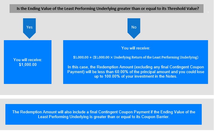 The Redemption Amount will also include a final Contingent Coupon Payment if the Ending Value of the Least Performing Underlying is greater than or equal to its Coupon Barrier. |