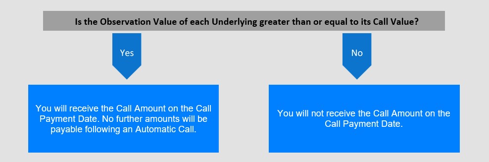All (but not less than all) of the Notes will be automatically called at an amount equal to the Call Amount if the Observation Value of each Underlying is greater than or equal to its Call Value on the Call Observation Date. If the Notes are automatically called, the Call Amount will be paid on the Call Payment Date. No further amounts will be payable following an Automatic Call.