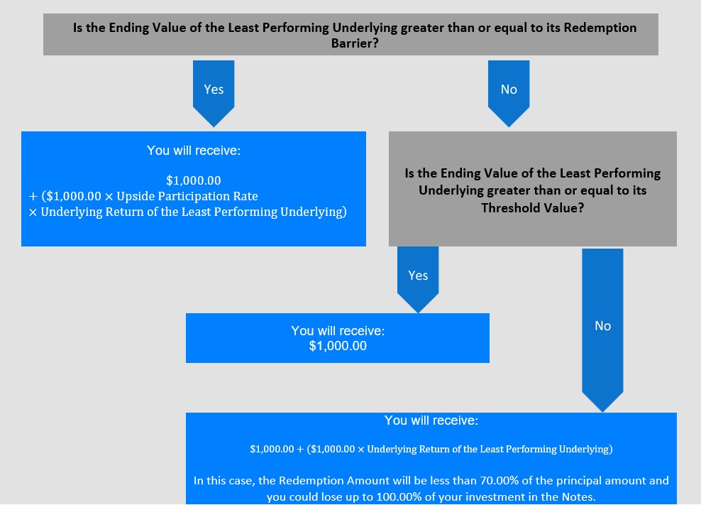 However, assuming the Notes are not called prior to maturity, if any Underlying declines by more than 30% from its Starting Value, at maturity your investment will be subject to 1:1 downside exposure to decreases in the value of the Least Performing Underlying, with up to 100% of the principal at risk. Otherwise, if the Notes are not called prior to maturity and the Ending Value of the Least Performing Underlying is less than 100.00% of its Starting Value but greater than or equal to 70% of its Starting Value, at maturity you will receive the principal amount of your Notes.