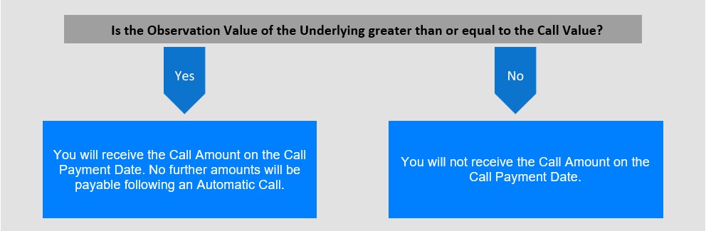 All (but not less than all) of the Notes will be automatically called at an amount equal to the Call Amount if the Observation Value of the Underlying is greater than or equal to the Call Value on the Call Observation Date. If the Notes are automatically called, the Call Amount will be paid on the Call Payment Date. No further amounts will be payable following an Automatic Call. |