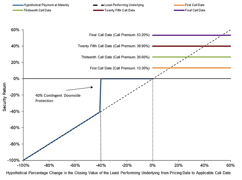 If the closing value of the Lowest Performing Underlying on any Call Date is greater than or equal to its Starting Value, the Securities will be automatically called for the principal amount plus the Call Premium applicable to that Call Date. |
