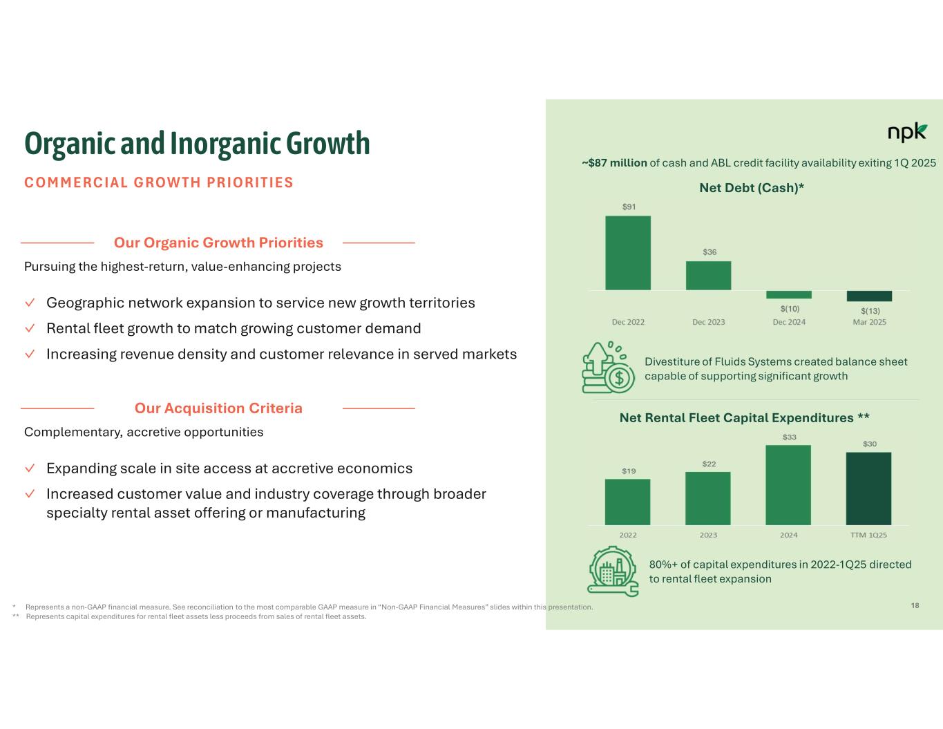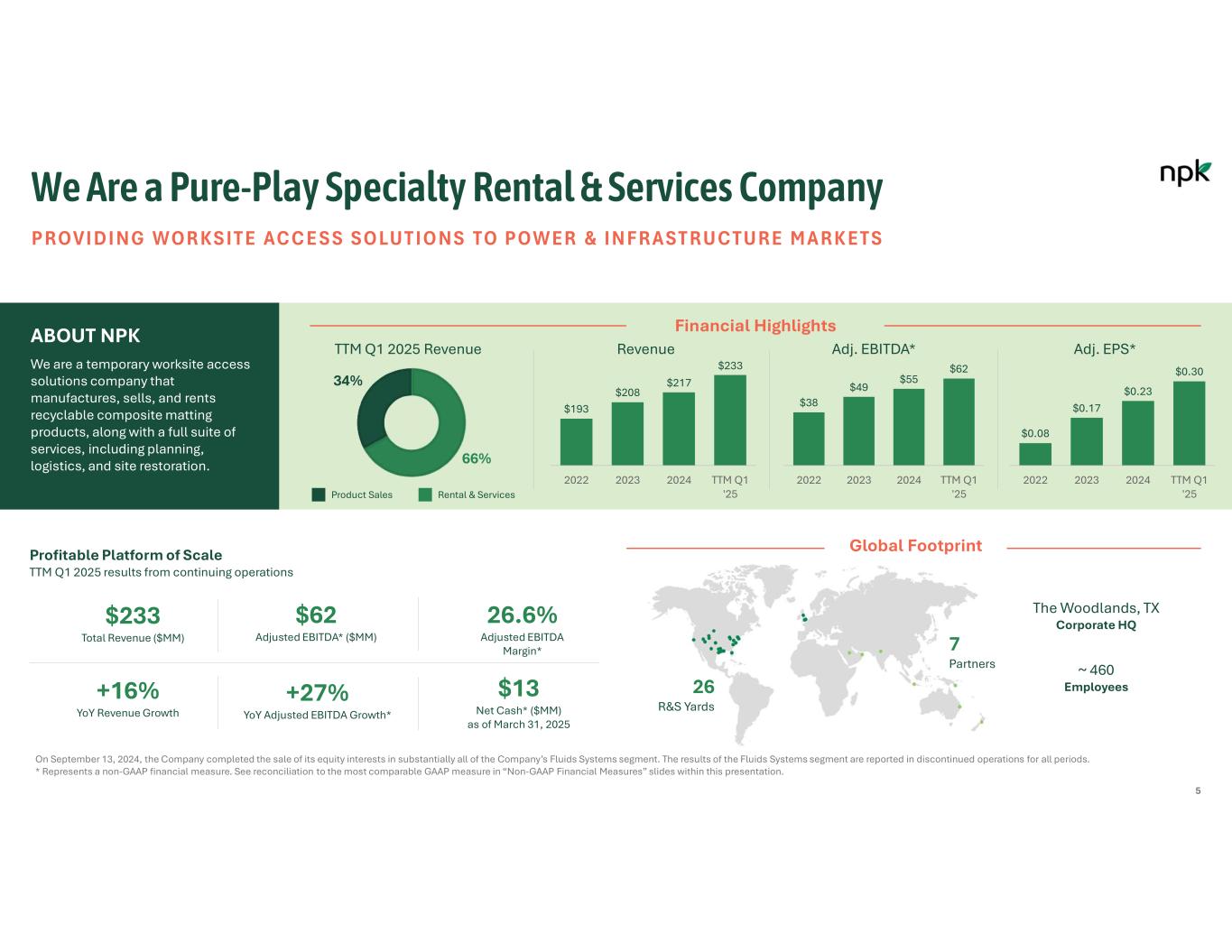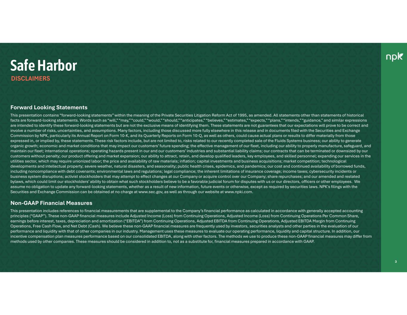 3 Safe Harbor DISCLAIMERS Forward Looking Statements This presentation contains “forward-looking statements” within the meaning of the Private Securities Litigation Reform Act of 1995, as amended. All statements other than statements of historical facts are forward-looking statements. Words such as “will,” “may,” “could,” “would,” “should,” “anticipates,” “believes,” “estimates,” “expects,” “plans,” “intends,” “guidance,” and similar expressions are intended to identify these forward-looking statements but are not the exclusive means of identifying them. These statements are not guarantees that our expectations will prove to be correct and involve a number of risks, uncertainties, and assumptions. Many factors, including those discussed more fully elsewhere in this release and in documents filed with the Securities and Exchange Commission by NPK, particularly its Annual Report on Form 10-K, and its Quarterly Reports on Form 10-Q, as well as others, could cause actual plans or results to differ materially from those expressed in, or implied by, these statements. These risk factors include, but are not limited to, risks related to our recently completed sale of the Fluids Systems business; our ability to generate organic growth; economic and market conditions that may impact our customers’ future spending; the effective management of our fleet, including our ability to properly manufacture, safeguard, and maintain our fleet; international operations; operating hazards present in our and our customers’ industries and substantial liability claims; our contracts that can be terminated or downsized by our customers without penalty; our product offering and market expansion; our ability to attract, retain, and develop qualified leaders, key employees, and skilled personnel; expanding our services in the utilities sector, which may require unionized labor; the price and availability of raw materials; inflation; capital investments and business acquisitions; market competition; technological developments and intellectual property; severe weather, natural disasters, and seasonality; public health crises, epidemics, and pandemics; our cost and continued availability of borrowed funds, including noncompliance with debt covenants; environmental laws and regulations; legal compliance; the inherent limitations of insurance coverage; income taxes; cybersecurity incidents or business system disruptions; activist stockholders that may attempt to effect changes at our Company or acquire control over our Company; share repurchases; and our amended and restated bylaws, which could limit our stockholders’ ability to obtain what such stockholders believe to be a favorable judicial forum for disputes with us or our directors, officers or other employees. We assume no obligation to update any forward-looking statements, whether as a result of new information, future events or otherwise, except as required by securities laws. NPK's filings with the Securities and Exchange Commission can be obtained at no charge at www.sec.gov, as well as through our website at www.npki.com. Non-GAAP Financial Measures This presentation includes references to financial measurements that are supplemental to the Company’s financial performance as calculated in accordance with generally accepted accounting principles (“GAAP”). These non-GAAP financial measures include Adjusted Income (Loss) from Continuing Operations, Adjusted Income (Loss) from Continuing Operations Per Common Share, earnings before interest, taxes, depreciation and amortization (“EBITDA”) from Continuing Operations, Adjusted EBITDA from Continuing Operations, Adjusted EBITDA Margin from Continuing Operations, Free Cash Flow, and Net Debt (Cash). We believe these non-GAAP financial measures are frequently used by investors, securities analysts and other parties in the evaluation of our performance and liquidity with that of other companies in our industry. Management uses these measures to evaluate our operating performance, liquidity and capital structure. In addition, our incentive compensation plan measures performance based on our consolidated EBITDA, along with other factors. The methods we use to produce these non-GAAP financial measures may differ from methods used by other companies. These measures should be considered in addition to, not as a substitute for, financial measures prepared in accordance with GAAP.
