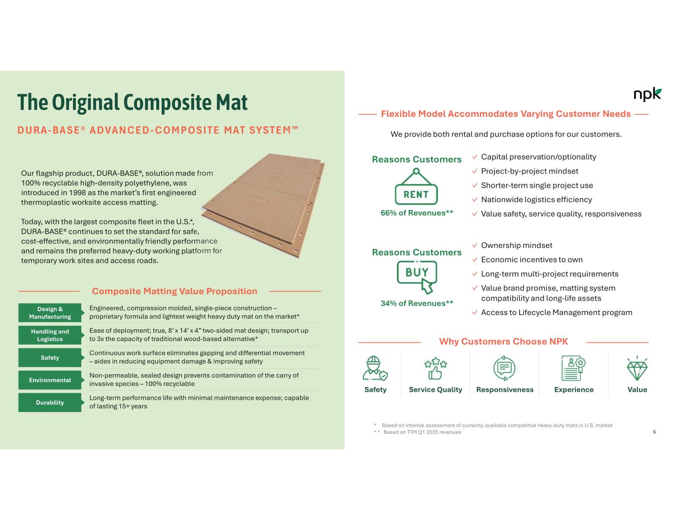 5 We Are a Pure-Play Specialty Rental & Services Company P ROVI DI NG WOR KS IT E ACC E S S SO LU T IO NS TO POW ER & IN FR AST R U CTU R E M A R K ETS ABOUT NPK We are a temporary worksite access solutions company that manufactures, sells, and rents recyclable composite matting products, along with a full suite of services, including planning, logistics, and site restoration. Financial Highlights 66% 34% Profitable Platform of Scale TTM Q1 2025 results from continuing operations Global Footprint 26 R&S Yards 7 Partners The Woodlands, TX Corporate HQ ~ 460 Employees $233 Total Revenue ($MM) $62 Adjusted EBITDA* ($MM) 26.6% Adjusted EBITDA Margin* +27% YoY Adjusted EBITDA Growth* +16% YoY Revenue Growth $13 Net Cash* ($MM) as of March 31, 2025 Rental & ServicesProduct Sales $193 $208 $217 $233 2022 2023 2024 TTM Q1 '25 Revenue $38 $49 $55 $62 2022 2023 2024 TTM Q1 '25 Adj. EBITDA* $0.08 $0.17 $0.23 $0.30 2022 2023 2024 TTM Q1 '25 Adj. EPS* On September 13, 2024, the Company completed the sale of its equity interests in substantially all of the Company’s Fluids Systems segment. The results of the Fluids Systems segment are reported in discontinued operations for all periods. * Represents a non-GAAP financial measure. See reconciliation to the most comparable GAAP measure in “Non-GAAP Financial Measures” slides within this presentation. TTM Q1 2025 Revenue
