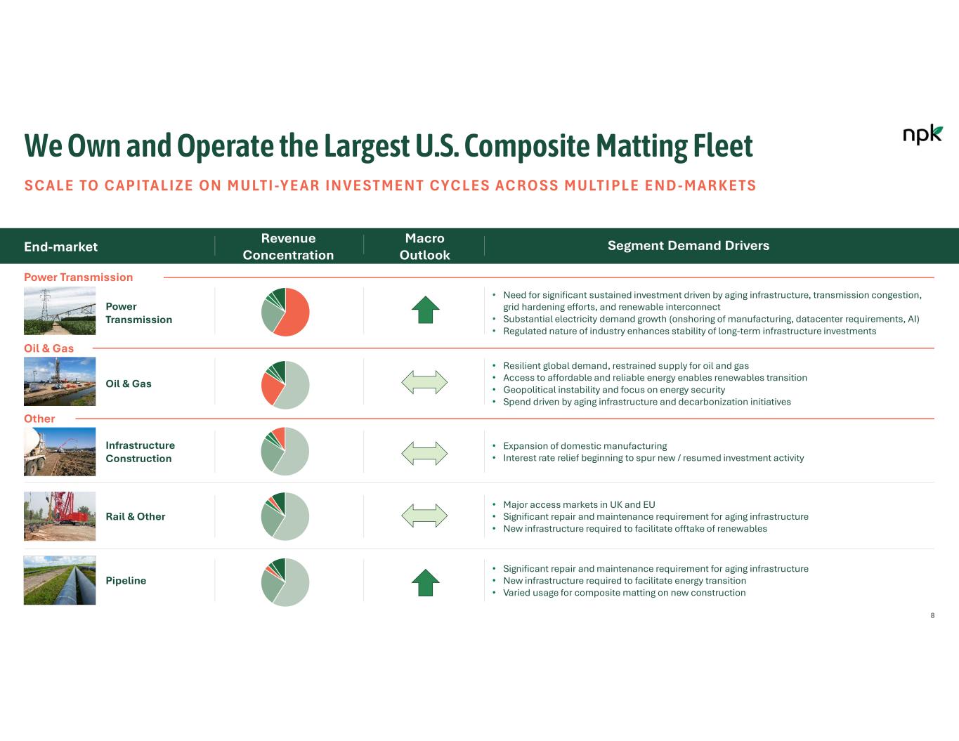 7 Vertically Integrated Model Supports Specialty End-Markets P RO DU CTS AN D SE R VI CE S • Introduced DURA-BASE® to the world over 25 years ago as the first 100% recyclable composite matting solution • Committed R&D, Project Technical Support team with industry-leading experience • Focus on reducing lifecycle waste and carbon emissions • State-of-the-art 93,000 square foot ISO 9001:2015 facility in Carencro, LA • Strategically located next to cost advantaged “Gulf Coast” suppliers • Sufficient production capacity to support growth for the next 3-5 years • Pre-planning assessment and access mat plan design • Temporary work sites and access roads • Ancillary services like SWPPP management and ground restoration at completion of operations • Largest heavy duty composite mat manufacturing capacity and rental service fleet in the U.S. • Supply small- and large-scale rental and sale requests • Experienced composite matting industry sales and national service operations team We Serve a Diverse Mix of Growing End-Markets Engineering & Design Precision Manufacturing Logistics Planning & Installation Specialty Rental, Product Sale Oil & Gas Pipeline Infrastructure Construction Rail & OtherPower Transmission We combine industry-leading IP and deep manufacturing expertise with on-demand logistics support and installation.