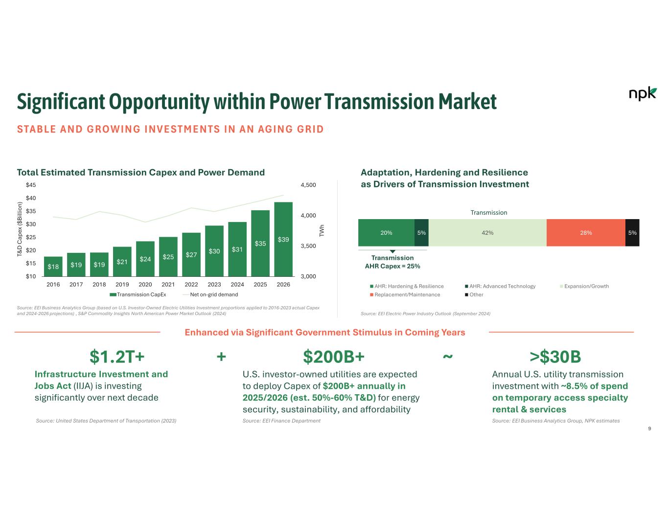 End-market Revenue Concentration Power Transmission Oil & Gas Other Power Transmission • Need for significant sustained investment driven by aging infrastructure, transmission congestion, grid hardening efforts, and renewable interconnect • Substantial electricity demand growth (onshoring of manufacturing, datacenter requirements, AI) • Regulated nature of industry enhances stability of long-term infrastructure investments Oil & Gas • Resilient global demand, restrained supply for oil and gas • Access to affordable and reliable energy enables renewables transition • Geopolitical instability and focus on energy security • Spend driven by aging infrastructure and decarbonization initiatives Rail & Other • Major access markets in UK and EU • Significant repair and maintenance requirement for aging infrastructure • New infrastructure required to facilitate offtake of renewables Segment Demand DriversMacro Outlook Pipeline • Significant repair and maintenance requirement for aging infrastructure • New infrastructure required to facilitate energy transition • Varied usage for composite matting on new construction Infrastructure Construction • Expansion of domestic manufacturing • Interest rate relief beginning to spur new / resumed investment activity 8 We Own and Operate the Largest U.S. Composite Matting Fleet S CAL E TO CAP ITA L I Z E ON M U LTI -Y E AR IN VE ST ME N T CYC L ES AC RO S S M U LT I PL E E ND - M AR KE TS