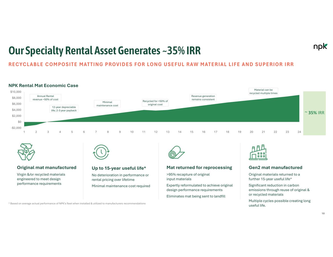 6 The Original Composite Mat D U R A - BA SE ® A DVAN C ED - C OM P OS IT E MAT SYSTE M Our flagship product, DURA-BASE®, solution made from 100% recyclable high-density polyethylene, was introduced in 1998 as the market’s first engineered thermoplastic worksite access matting. Today, with the largest composite fleet in the U.S.*, DURA-BASE® continues to set the standard for safe, cost-effective, and environmentally friendly performance and remains the preferred heavy-duty working platform for temporary work sites and access roads. Composite Matting Value Proposition Engineered, compression molded, single-piece construction – proprietary formula and lightest weight heavy duty mat on the market* Design & Manufacturing Ease of deployment; true, 8’ x 14’ x 4” two-sided mat design; transport up to 3x the capacity of traditional wood-based alternative* Handling and Logistics Continuous work surface eliminates gapping and differential movement – aides in reducing equipment damage & improving safetySafety Non-permeable, sealed design prevents contamination of the carry of invasive species – 100% recyclable Environmental Long-term performance life with minimal maintenance expense; capable of lasting 15+ years Durability * Based on internal assessment of currently available competitive heavy-duty mats in U.S. market * * Based on TTM Q1 2025 revenues ✓ Capital preservation/optionality ✓ Project-by-project mindset ✓ Shorter-term single project use ✓ Nationwide logistics efficiency ✓ Value safety, service quality, responsiveness We provide both rental and purchase options for our customers. Flexible Model Accommodates Varying Customer Needs ✓ Ownership mindset ✓ Economic incentives to own ✓ Long-term multi-project requirements ✓ Value brand promise, matting system compatibility and long-life assets ✓ Access to Lifecycle Management program Reasons Customers 66% of Revenues** Reasons Customers 34% of Revenues** Why Customers Choose NPK Safety Service Quality Responsiveness Experience Value