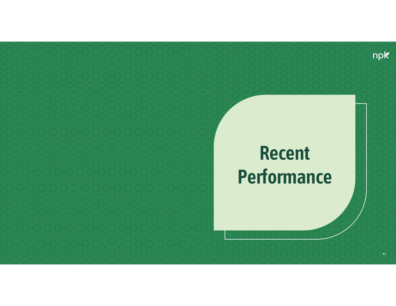 10 Our Specialty Rental Asset Generates ~35% IRR R ECYC L A BL E C OM PO S IT E MAT TI NG P ROVI D ES F O R LO NG U S E F U L R AW M AT ER IA L L IFE A N D SU P E R IO R I R R -$2,000 $0 $2,000 $4,000 $6,000 $8,000 $10,000 1 2 3 4 5 6 7 8 9 10 11 12 13 14 15 16 17 18 19 20 21 22 23 24 NPK Rental Mat Economic Case ~ 35% IRR Annual Rental revenue ~50% of cost 12-year depreciable life; 2-3 year payback Minimal maintenance cost Recycled for <50% of original cost Revenue generation remains consistent Material can be recycled multiple times Original mat manufactured Virgin &/or recycled materials engineered to meet design performance requirements Up to 15-year useful life* No deterioration in performance or rental pricing over lifetime Minimal maintenance cost required Mat returned for reprocessing >95% recapture of original input materials Expertly reformulated to achieve original design performance requirements Eliminates mat being sent to landfill Gen2 mat manufactured Original materials returned to a further 15-year useful life* Significant reduction in carbon emissions through reuse of original & or recycled materials Multiple cycles possible creating long useful life.* Based on average actual performance of NPK’s fleet when installed & utilized to manufacturers recommendations