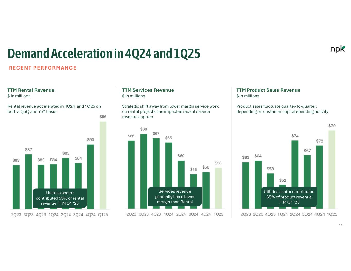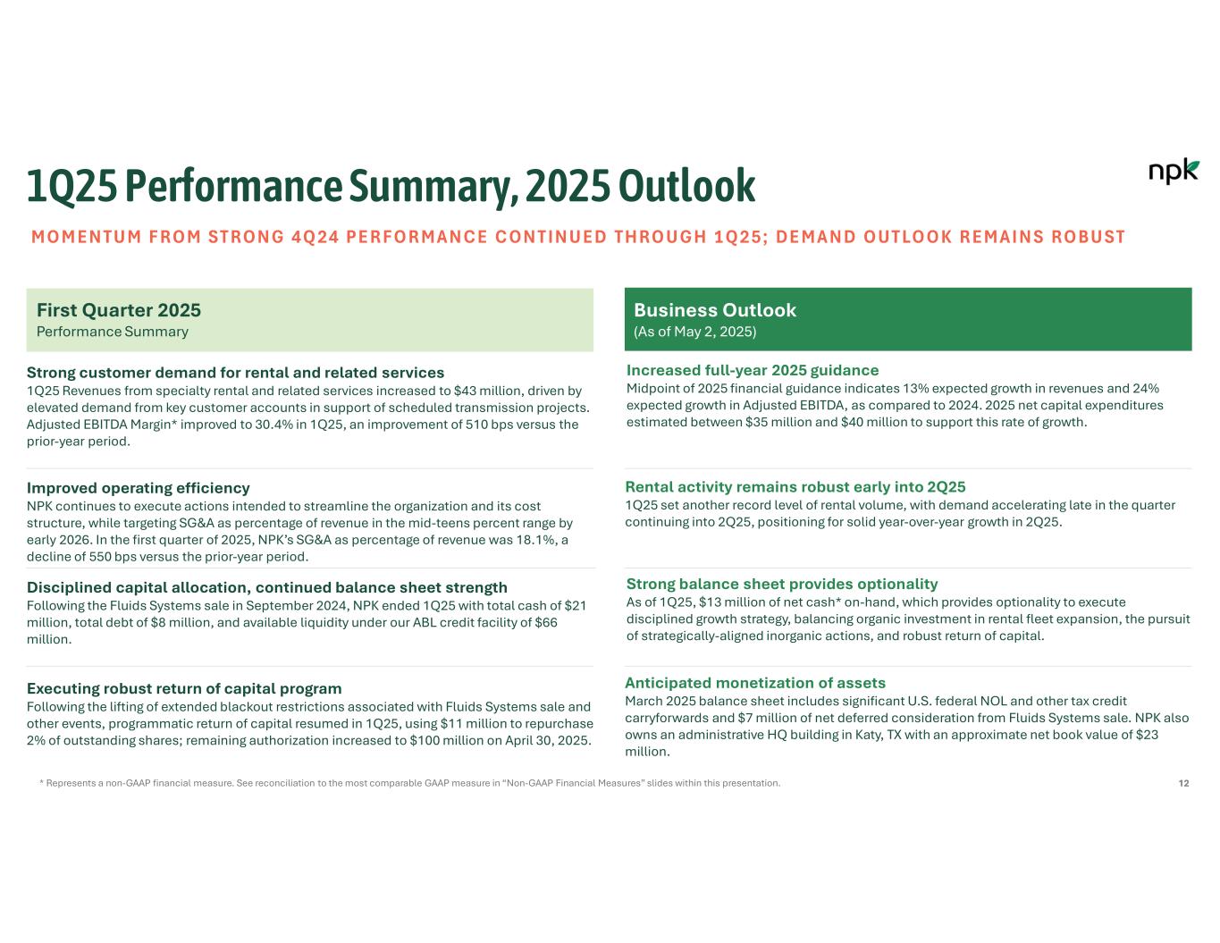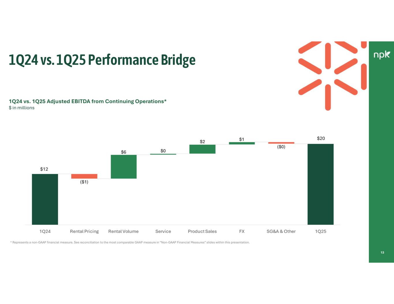 12 1Q25 Performance Summary, 2025 Outlook M O M E N TU M F R O M ST R O N G 4 Q 2 4 P E R F O R M A N C E C O N T IN U E D TH R O U G H 1 Q 2 5 ; DE M A N D O U T LO O K R E M A I N S R O B U ST First Quarter 2025 Performance Summary Business Outlook (As of May 2, 2025) Strong customer demand for rental and related services 1Q25 Revenues from specialty rental and related services increased to $43 million, driven by elevated demand from key customer accounts in support of scheduled transmission projects. Adjusted EBITDA Margin* improved to 30.4% in 1Q25, an improvement of 510 bps versus the prior-year period. Executing robust return of capital program Following the lifting of extended blackout restrictions associated with Fluids Systems sale and other events, programmatic return of capital resumed in 1Q25, using $11 million to repurchase 2% of outstanding shares; remaining authorization increased to $100 million on April 30, 2025. Improved operating efficiency NPK continues to execute actions intended to streamline the organization and its cost structure, while targeting SG&A as percentage of revenue in the mid-teens percent range by early 2026. In the first quarter of 2025, NPK’s SG&A as percentage of revenue was 18.1%, a decline of 550 bps versus the prior-year period. Disciplined capital allocation, continued balance sheet strength Following the Fluids Systems sale in September 2024, NPK ended 1Q25 with total cash of $21 million, total debt of $8 million, and available liquidity under our ABL credit facility of $66 million. Anticipated monetization of assets March 2025 balance sheet includes significant U.S. federal NOL and other tax credit carryforwards and $7 million of net deferred consideration from Fluids Systems sale. NPK also owns an administrative HQ building in Katy, TX with an approximate net book value of $23 million. Rental activity remains robust early into 2Q25 1Q25 set another record level of rental volume, with demand accelerating late in the quarter continuing into 2Q25, positioning for solid year-over-year growth in 2Q25. Increased full-year 2025 guidance Midpoint of 2025 financial guidance indicates 13% expected growth in revenues and 24% expected growth in Adjusted EBITDA, as compared to 2024. 2025 net capital expenditures estimated between $35 million and $40 million to support this rate of growth. Strong balance sheet provides optionality As of 1Q25, $13 million of net cash* on-hand, which provides optionality to execute disciplined growth strategy, balancing organic investment in rental fleet expansion, the pursuit of strategically-aligned inorganic actions, and robust return of capital. * Represents a non-GAAP financial measure. See reconciliation to the most comparable GAAP measure in “Non-GAAP Financial Measures” slides within this presentation.