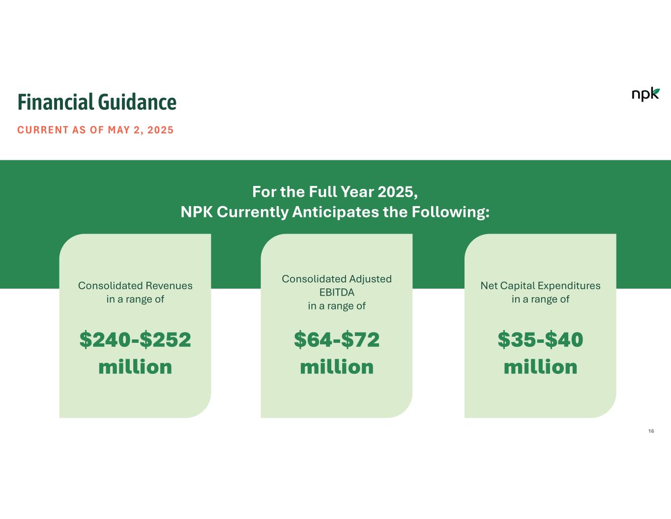 For the Full Year 2025, NPK Currently Anticipates the Following: Financial Guidance C U R R E N T AS O F M AY 2 , 2 0 2 5 Consolidated Revenues in a range of Consolidated Adjusted EBITDA in a range of Net Capital Expenditures in a range of $240-$252 million $64-$72 million $35-$40 million 16