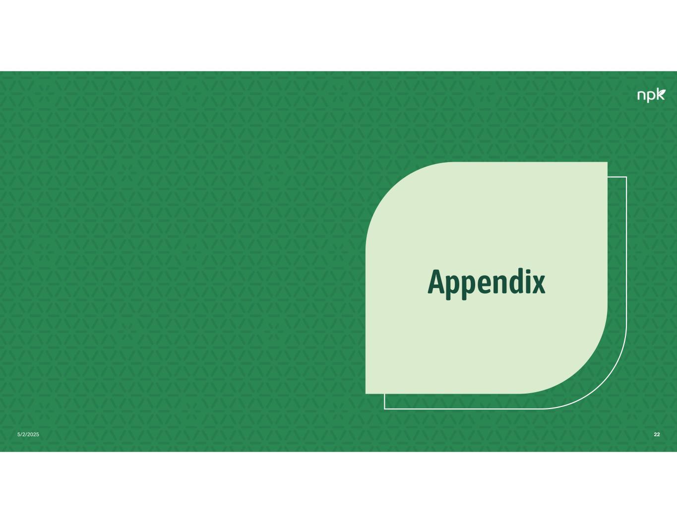 Investment Conclusion 21 VALU E C R E ATI ON ROA DM A P We are a pure-play worksite access solutions business NPK has become a leading, pure-play specialty rental and services company serving the global worksite access and critical infrastructure markets, creating a simpler, higher-margin, more profitable business entering 2025. We are a leader within the composite matting industry We own and operate the largest compositive matting fleet in the United States; our specialty rental unit economics support an IRR of approximately 35%. We operate a vertically integrated model that supports superior ROIC We have developed in-house engineering & design, manufacturing, logistics and installation capabilities that, in combination, have positioned us to drive consistent value creation for our customers, and enhance return of invested capital through revenue growth. We subscribe to a disciplined capital allocation strategy As of March 2025, we had ~$87 million in cash and availability under our ABL. We redeploy cash from operations toward a combination of organic investment, share repurchases, and opportunistic investments in complementary worksite access assets. We operate a highly cash generative business Our cash generative business provides capital to support our capital allocation priorities.
