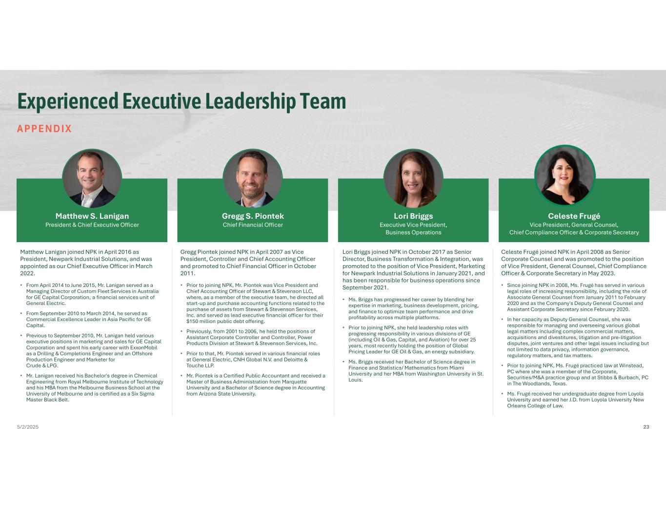 5/2/2025 23 Experienced Executive Leadership Team A PP E ND IX Matthew Lanigan joined NPK in April 2016 as President, Newpark Industrial Solutions, and was appointed as our Chief Executive Officer in March 2022. • From April 2014 to June 2015, Mr. Lanigan served as a Managing Director of Custom Fleet Services in Australia for GE Capital Corporation, a financial services unit of General Electric. • From September 2010 to March 2014, he served as Commercial Excellence Leader in Asia Pacific for GE Capital. • Previous to September 2010, Mr. Lanigan held various executive positions in marketing and sales for GE Capital Corporation and spent his early career with ExxonMobil as a Drilling & Completions Engineer and an Offshore Production Engineer and Marketer for Crude & LPG. • Mr. Lanigan received his Bachelor's degree in Chemical Engineering from Royal Melbourne Institute of Technology and his MBA from the Melbourne Business School at the University of Melbourne and is certified as a Six Sigma Master Black Belt. Gregg Piontek joined NPK in April 2007 as Vice President, Controller and Chief Accounting Officer and promoted to Chief Financial Officer in October 2011. • Prior to joining NPK, Mr. Piontek was Vice President and Chief Accounting Officer of Stewart & Stevenson LLC, where, as a member of the executive team, he directed all start-up and purchase accounting functions related to the purchase of assets from Stewart & Stevenson Services, Inc. and served as lead executive financial officer for their $150 million public debt offering. • Previously, from 2001 to 2006, he held the positions of Assistant Corporate Controller and Controller, Power Products Division at Stewart & Stevenson Services, Inc. • Prior to that, Mr. Piontek served in various financial roles at General Electric, CNH Global N.V. and Deloitte & Touche LLP. • Mr. Piontek is a Certified Public Accountant and received a Master of Business Administration from Marquette University and a Bachelor of Science degree in Accounting from Arizona State University. Lori Briggs joined NPK in October 2017 as Senior Director, Business Transformation & Integration, was promoted to the position of Vice President, Marketing for Newpark Industrial Solutions in January 2021, and has been responsible for business operations since September 2021. • Ms. Briggs has progressed her career by blending her expertise in marketing, business development, pricing, and finance to optimize team performance and drive profitability across multiple platforms. • Prior to joining NPK, she held leadership roles with progressing responsibility in various divisions of GE (including Oil & Gas, Capital, and Aviation) for over 25 years, most recently holding the position of Global Pricing Leader for GE Oil & Gas, an energy subsidiary. • Ms. Briggs received her Bachelor of Science degree in Finance and Statistics/ Mathematics from Miami University and her MBA from Washington University in St. Louis. Celeste Frugé joined NPK in April 2008 as Senior Corporate Counsel and was promoted to the position of Vice President, General Counsel, Chief Compliance Officer & Corporate Secretary in May 2023. • Since joining NPK in 2008, Ms. Frugé has served in various legal roles of increasing responsibility, including the role of Associate General Counsel from January 2011 to February 2020 and as the Company's Deputy General Counsel and Assistant Corporate Secretary since February 2020. • In her capacity as Deputy General Counsel, she was responsible for managing and overseeing various global legal matters including complex commercial matters, acquisitions and divestitures, litigation and pre-litigation disputes, joint ventures and other legal issues including but not limited to data privacy, information governance, regulatory matters, and tax matters. • Prior to joining NPK, Ms. Frugé practiced law at Winstead, PC where she was a member of the Corporate, Securities/M&A practice group and at Stibbs & Burbach, PC in The Woodlands, Texas. • Ms. Frugé received her undergraduate degree from Loyola University and earned her J.D. from Loyola University New Orleans College of Law. Matthew S. Lanigan President & Chief Executive Officer Gregg S. Piontek Chief Financial Officer Lori Briggs Executive Vice President, Business Operations Celeste Frugé Vice President, General Counsel, Chief Compliance Officer & Corporate Secretary