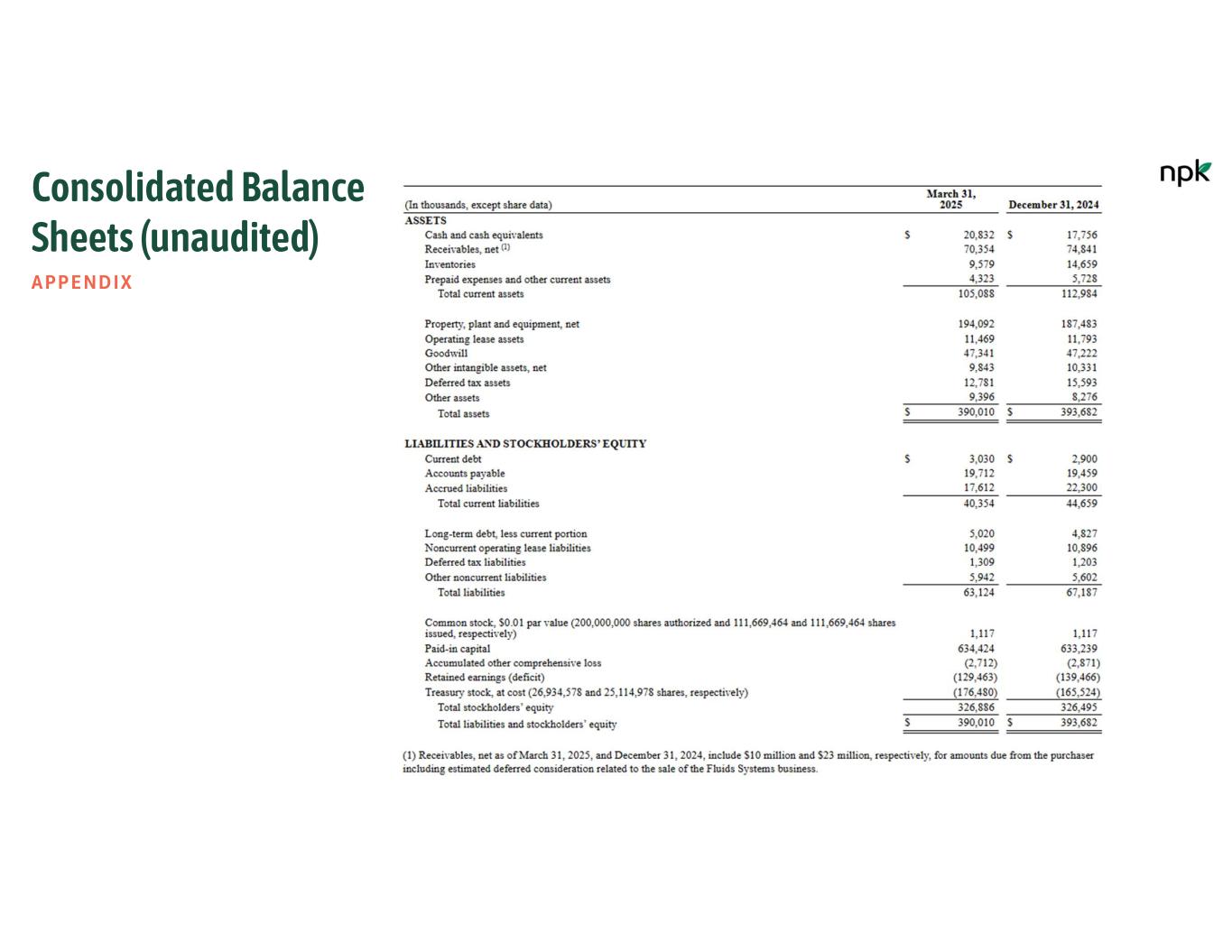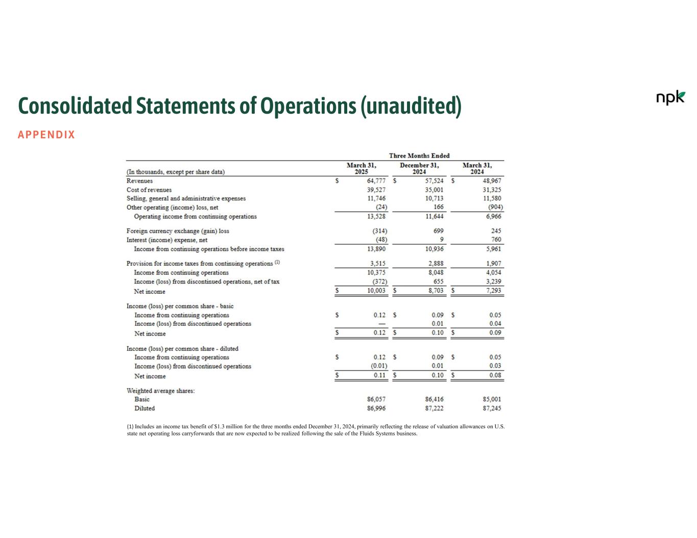 Consolidated Statements of Operations (unaudited) A PP E ND IX 24 (1) Includes an income tax benefit of $1.3 million for the three months ended December 31, 2024, primarily reflecting the release of valuation allowances on U.S. state net operating loss carryforwards that are now expected to be realized following the sale of the Fluids Systems business.
