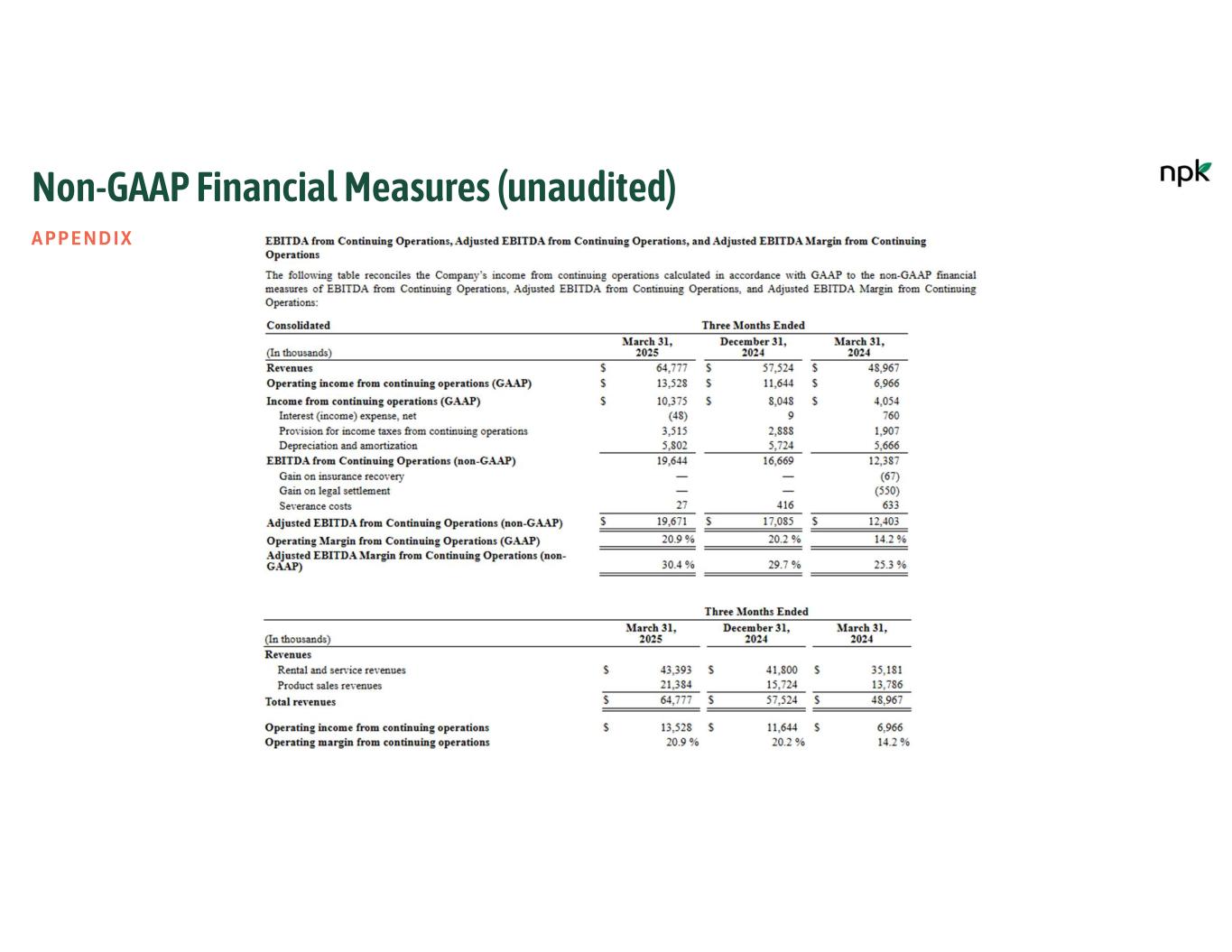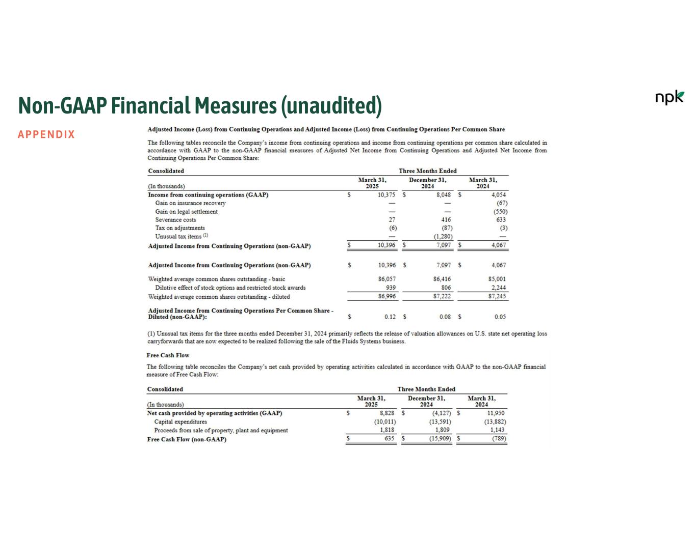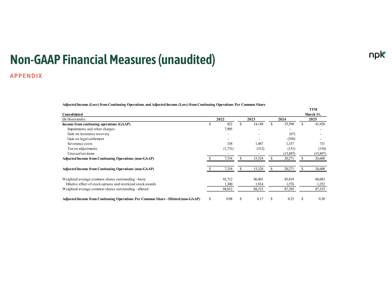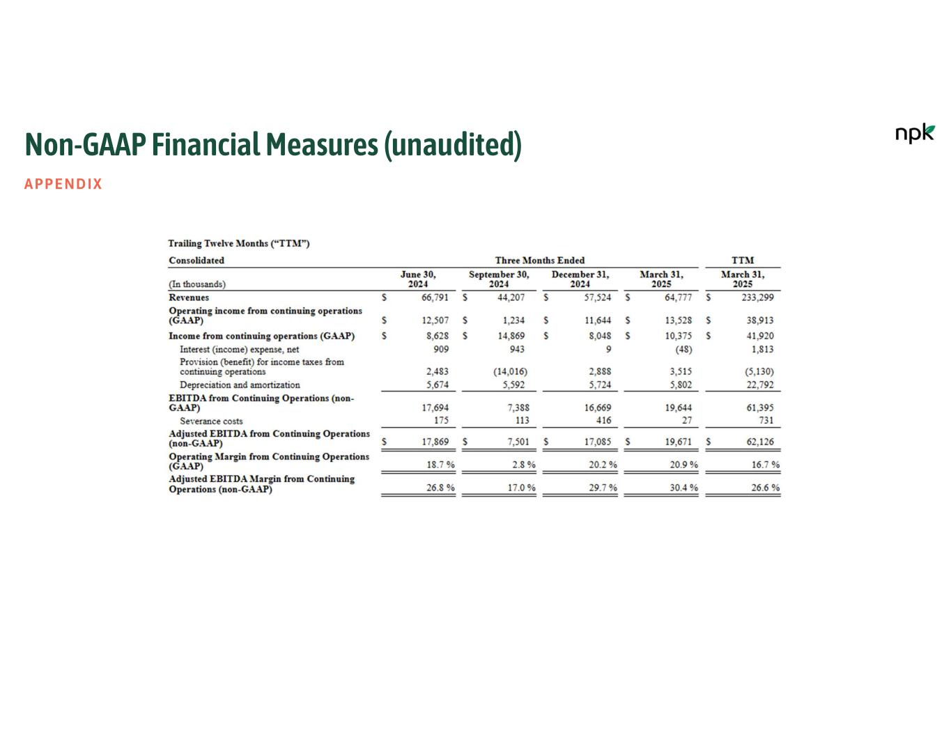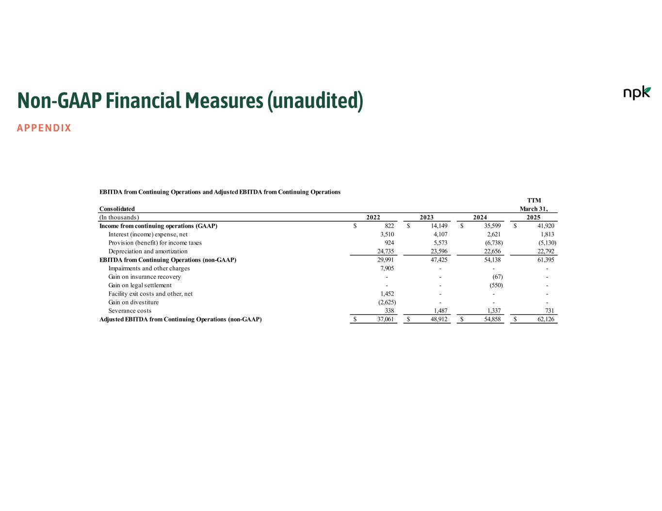 Non-GAAP Financial Measures (unaudited) A PP E ND IX Consolidated (In thousands) 2022 2023 2024 2025 Income from continuing operations (GAAP) 822$ 14,149$ 35,599$ 41,920$ Interest (income) expense, net 3,510 4,107 2,621 1,813 Provision (benefit) for income taxes 924 5,573 (6,738) (5,130) Depreciation and amortization 24,735 23,596 22,656 22,792 EBITDA from Continuing Operations (non-GAAP) 29,991 47,425 54,138 61,395 Impairments and other charges 7,905 - - - Gain on insurance recovery - - (67) - Gain on legal settlement - - (550) - Facility exit costs and other, net 1,452 - - - Gain on divestiture (2,625) - - - Severance costs 338 1,487 1,337 731 Adjusted EBITDA from Continuing Operations (non-GAAP) 37,061$ 48,912$ 54,858$ 62,126$ TTM March 31, EBITDA from Continuing Operations and Adjusted EBITDA from Continuing Operations