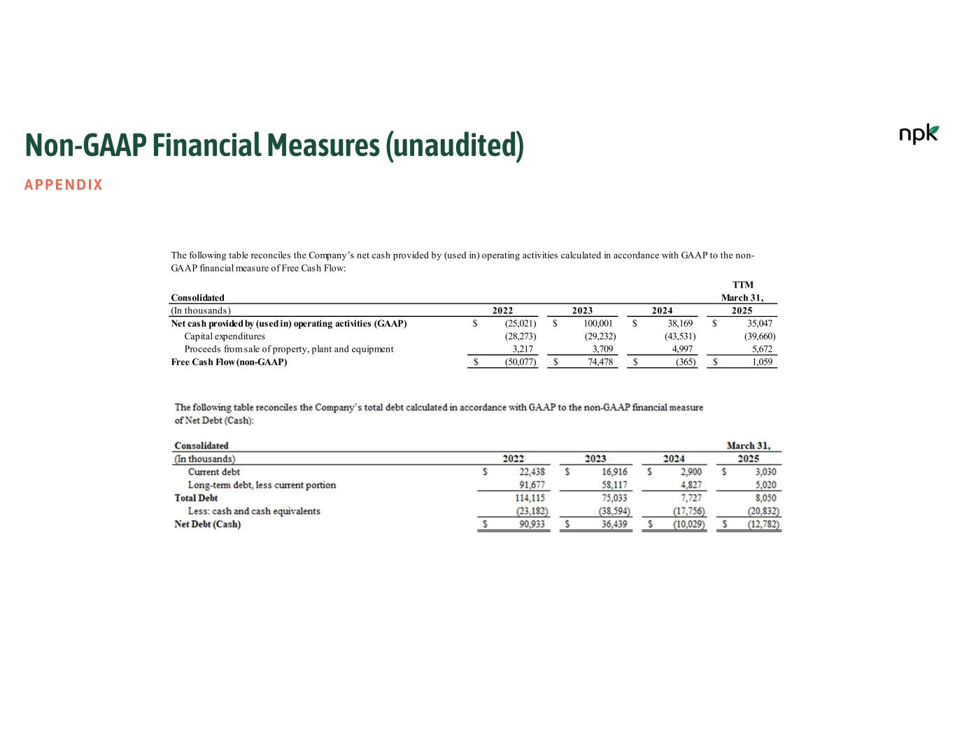 Non-GAAP Financial Measures (unaudited) A PP E ND IX Consolidated (In thousands) 2022 2023 2024 2025 Net cash provided by (used in) operating activities (GAAP) (25,021)$ 100,001$ 38,169$ 35,047$ Capital expenditures (28,273) (29,232) (43,531) (39,660) Proceeds from sale of property, plant and equipment 3,217 3,709 4,997 5,672 Free Cash Flow (non-GAAP) (50,077)$ 74,478$ (365)$ 1,059$ TTM March 31, The following table reconciles the Company’s net cash provided by (used in) operating activities calculated in accordance with GAAP to the non- GAAP financial measure of Free Cash Flow: