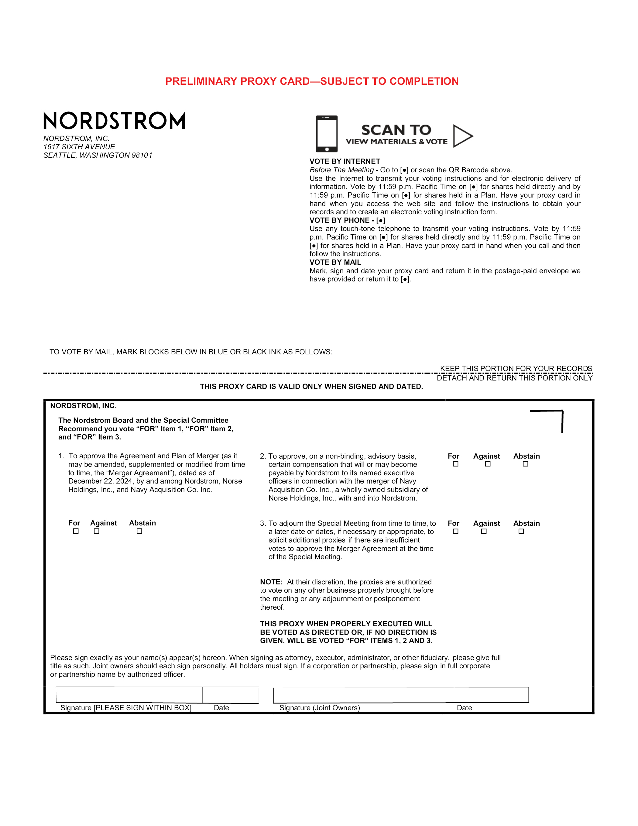 PRELIMINARY PROXY CARD—SUBJECT TO COMPLETION VOTE BY INTERNET Before The Meeting - Go to [●] or scan the QR Barcode above. Use the Internet to transmit your voting instructions and for electronic delivery of information. Vote by 11:59 p.m. Pacific Time on [●] for shares held directly and by 11:59 p.m. Pacific Time on [●] for shares held in a Plan. Have your proxy card in hand when you access the web site and follow the instructions to obtain your records and to create an electronic voting instruction form. VOTE BY PHONE - [●] Use any touch-tone telephone to transmit your voting instructions. Vote by 11:59 p.m. Pacific Time on [●] for shares held directly and by 11:59 p.m. Pacific Time on [●] for shares held in a Plan. Have your proxy card in hand when you call and then follow the instructions. VOTE BY MAIL Mark, sign and date your proxy card and return it in the postage-paid envelope we have provided or return it to [●]. Scan to view materials & vote NORDSTROM, INC. 1617 SIXTH AVENUE SEATTLE, WASHINGTON 98101 Nordstrom TO VOTE BY MAIL, MARK BLOCKS BELOW IN BLUE OR BLACK INK AS FOLLOWS: KEEP THIS PORTION FOR YOUR RECORDS DETACH AND RETURN THIS PORTION ONLY THIS PROXY CARD IS VALID ONLY WHEN SIGNED AND DATED. NORDSTROM, INC. The Nordstrom Board and the Special Committee Recommend you vote “FOR” Item 1, “FOR” Item 2, and “FOR” Item 3. 1. To approve the Agreement and Plan of Merger (as it may be amended, supplemented or modified from time to time, the “Merger Agreement”), dated as of December 22, 2024, by and among Nordstrom, Norse Holdings, Inc., and Navy Acquisition Co. Inc. For Against Abstain _ _ _ 2. To approve, on a non-binding, advisory basis, certain compensation that will or may become payable by Nordstrom to its named executive officers in connection with the merger of Navy Acquisition Co. Inc., a wholly owned subsidiary of Norse Holdings, Inc., with and into Nordstrom. 3. To adjourn the Special Meeting from time to time, to a later date or dates, if necessary or appropriate, to solicit additional proxies if there are insufficient votes to approve the Merger Agreement at the time of the Special Meeting. NOTE: At their discretion, the proxies are authorized to vote on any other business properly brought before the meeting or any adjournment or postponement thereof. THIS PROXY WHEN PROPERLY EXECUTED WILL BE VOTED AS DIRECTED OR, IF NO DIRECTION IS GIVEN, WILL BE VOTED “FOR” ITEMS 1, 2 AND 3. For Against Abstain For Against Abstain Please sign exactly as your name(s) appear(s) hereon. When signing as attorney, executor, administrator, or other fiduciary, please give full title as such. Joint owners should each sign personally. All holders must sign. If a corporation or partnership, please sign in full corporate or partnership name by authorized officer. Signature [PLEASE SIGN WITHIN BOX] Date Signature (Joint Owners) Date