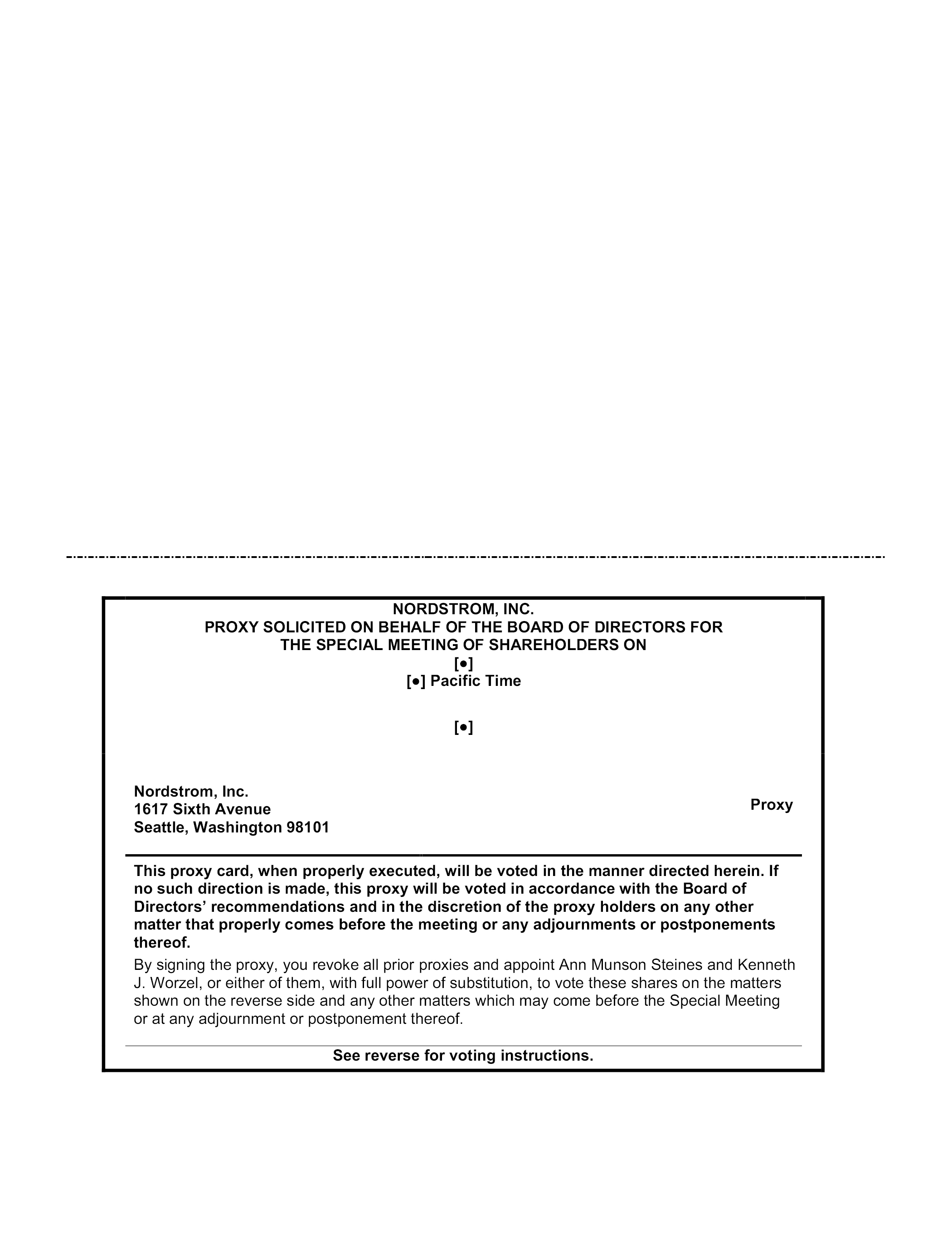 NORDSTROM, INC. PROXY SOLICITED ON BEHALF OF THE BOARD OF DIRECTORS FOR THE SPECIAL MEETING OF SHAREHOLDERS ON [●] [●] Pacific Time [●] Nordstrom, Inc. 1617 Sixth Avenue Seattle, Washington 98101 Proxy This proxy card, when properly executed, will be voted in the manner directed herein. If no such direction is made, this proxy will be voted in accordance with the Board of Directors’ recommendations and in the discretion of the proxy holders on any other matter that properly comes before the meeting or any adjournments or postponements thereof. By signing the proxy, you revoke all prior proxies and appoint Ann Munson Steines and Kenneth J. Worzel, or either of them, with full power of substitution, to vote these shares on the matters shown on the reverse side and any other matters which may come before the Special Meeting or at any adjournment or postponement thereof. See reverse for voting instructions.