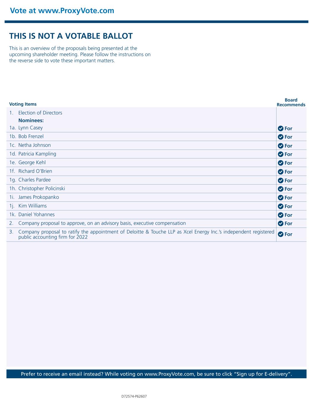 THIS IS NOT A VOTABLE BALLOT This is an overview of the proposals being presented at the upcoming shareholder meeting. Please follow the instructions on the reverse side to vote these important matters. Vote at www.ProxyVote.com Prefer to receive an email instead? While voting on www.ProxyVote.com, be sure to click “Sign up for E-delivery”. Voting Items Board Recommends D72574-P62607 1. Election of Directors Nominees: 1c. Netha Johnson 1a. Lynn Casey 1d. Patricia Kampling 1b. Bob Frenzel 1e. George Kehl 1f. Richard O’Brien 1g. Charles Pardee 1h. Christopher Policinski 1i. James Prokopanko 1j. Kim Williams 1k. Daniel Yohannes 2. Company proposal to approve, on an advisory basis, executive compensation 3. Company proposal to ratify the appointment of Deloitte & Touche LLP as Xcel Energy Inc.’s independent registered public accounting firm for 2022 For For For For For For For For For For For For For