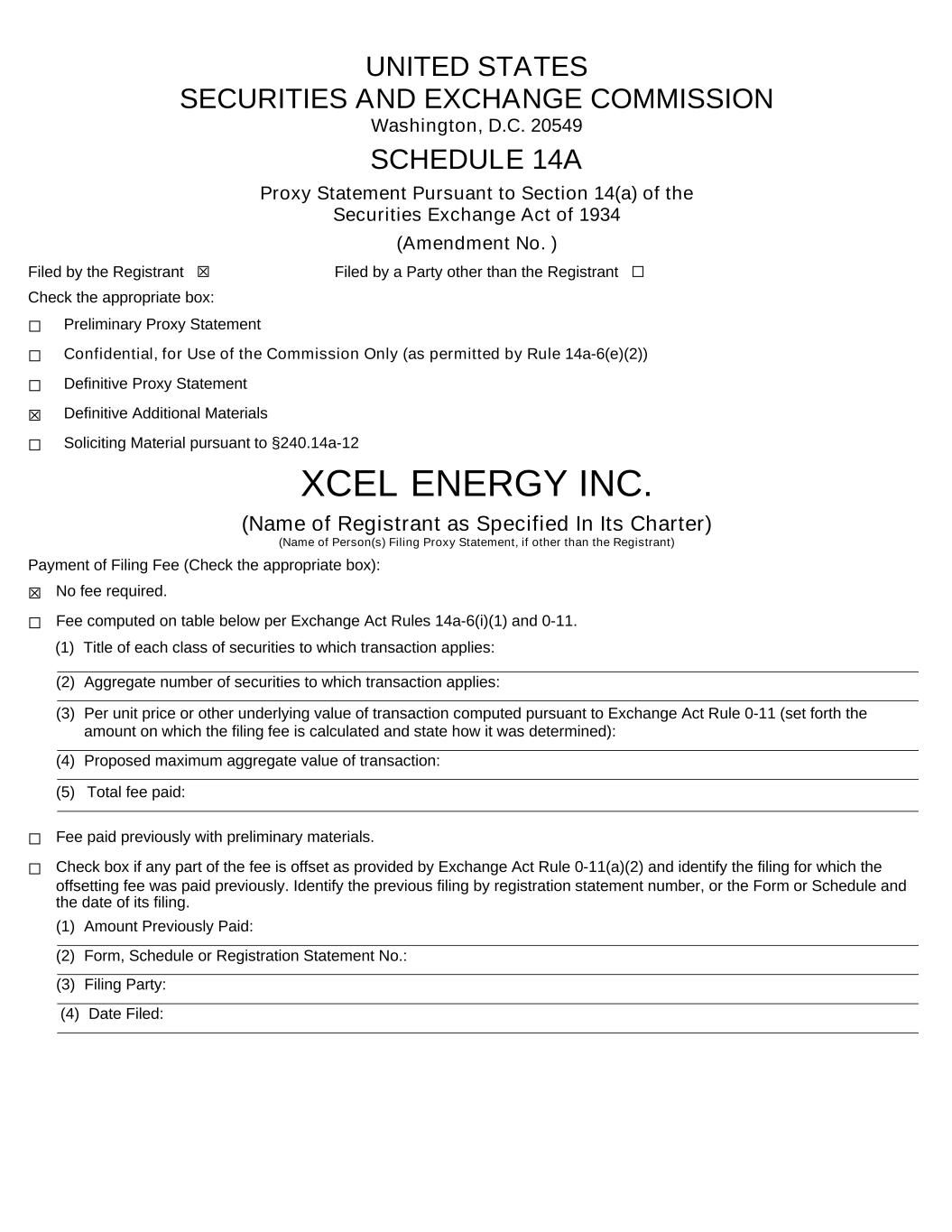 Your Vote Counts! XCEL ENERGY INC. 2022 Annual Meeting Vote by May 17, 2022 11:59 PM ET You invested in XCEL ENERGY INC. and it’s time to vote! You have the right to vote on proposals being presented at the Annual Meeting. This is an important notice regarding the availability of proxy material for the shareholder meeting to be held on May 18, 2022. Vote Virtually at the Meeting* May 18, 2022 11:00 a.m. Central Time Virtually at: www.virtualshareholdermeeting.com/XEL2022 *Please check the meeting materials for any special requirements for meeting attendance. Smartphone users Point your camera here and vote without entering a control number V1.1 For complete information and to vote, visit www.ProxyVote.com Control # D72573-P62607 Get informed before you vote View the Annual Report and Notice and Proxy Statement online OR you can receive a free paper or email copy of the material(s) by requesting prior to May 4, 2022. If you would like to request a copy of the material(s) for this and/or future shareholder meetings, you may (1) visit www.ProxyVote.com, (2) call 1-800-579-1639 or (3) send an email to sendmaterial@proxyvote.com. If sending an email, please include your control number (indicated below) in the subject line. Unless requested, you will not otherwise receive a paper or email copy. XCEL ENERGY INC. 414 NICOLLET MALL MINNEAPOLIS, MN 55401 ATTN: INVESTOR RELATIONS