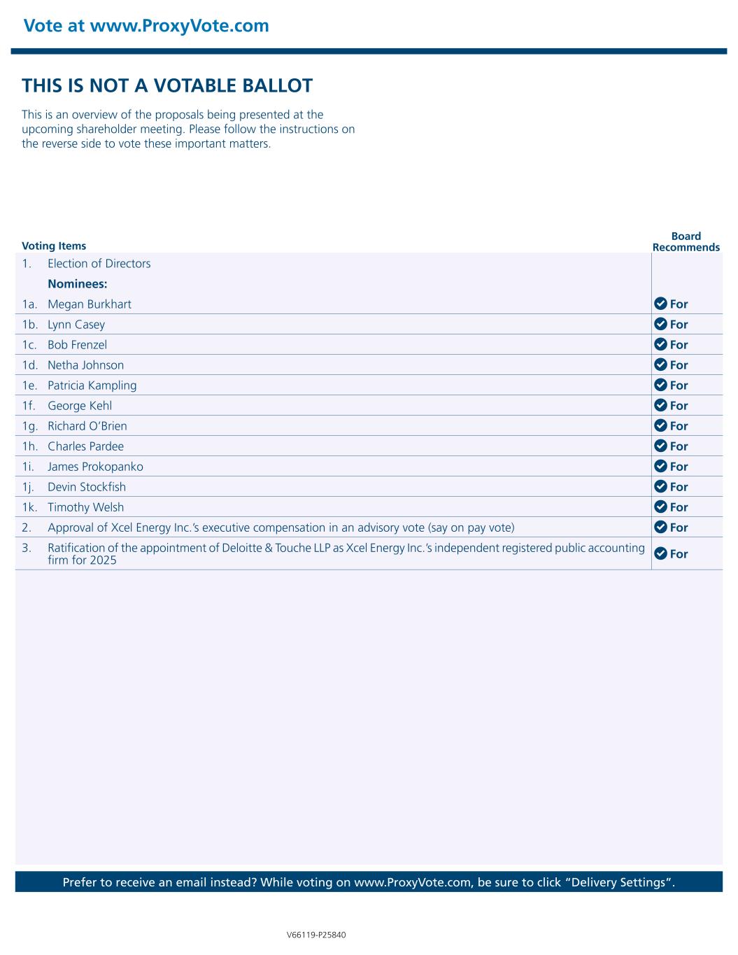THIS IS NOT A VOTABLE BALLOT This is an overview of the proposals being presented at the upcoming shareholder meeting. Please follow the instructions on the reverse side to vote these important matters. Vote at www.ProxyVote.com Prefer to receive an email instead? While voting on www.ProxyVote.com, be sure to click “Delivery Settings”. Voting Items Board Recommends V66119-P25840 1. Election of Directors Nominees: 1a. Megan Burkhart For 1b. Lynn Casey For 1c. Bob Frenzel For 1d. Netha Johnson For 1e. Patricia Kampling For 1f. George Kehl For 1g. Richard O’Brien For 1h. Charles Pardee For 1i. James Prokopanko For 1j. Devin Stockfish For 1k. Timothy Welsh For 2. Approval of Xcel Energy Inc.’s executive compensation in an advisory vote (say on pay vote) For 3. Ratification of the appointment of Deloitte & Touche LLP as Xcel Energy Inc.’s independent registered public accounting firm for 2025 For