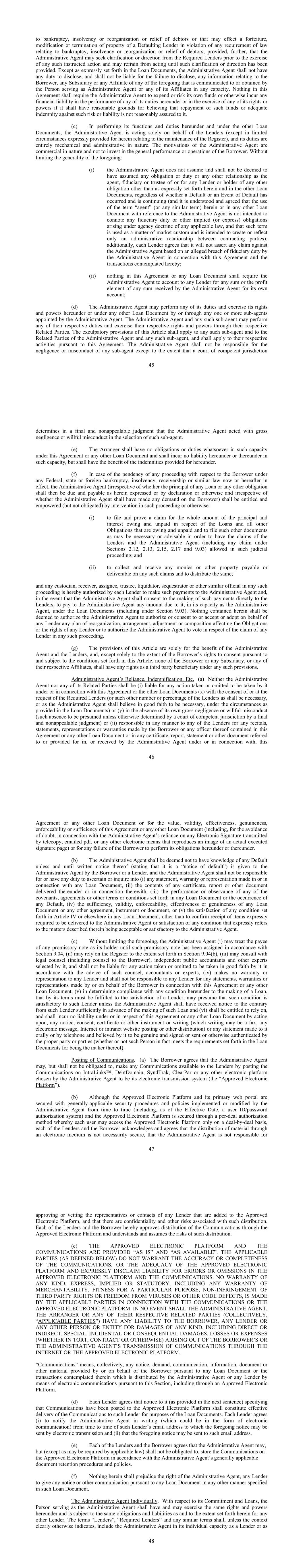 45 to bankruptcy, insolvency or reorganization or relief of debtors or that may effect a forfeiture, modification or termination of property of a Defaulting Lender in violation of any requirement of law relating to bankruptcy, insolvency or reorganization or relief of debtors; provided, further, that the Administrative Agent may seek clarification or direction from the Required Lenders prior to the exercise of any such instructed action and may refrain from acting until such clarification or direction has been provided. Except as expressly set forth in the Loan Documents, the Administrative Agent shall not have any duty to disclose, and shall not be liable for the failure to disclose, any information relating to the Borrower, any Subsidiary or any Affiliate of any of the foregoing that is communicated to or obtained by the Person serving as Administrative Agent or any of its Affiliates in any capacity. Nothing in this Agreement shall require the Administrative Agent to expend or risk its own funds or otherwise incur any financial liability in the performance of any of its duties hereunder or in the exercise of any of its rights or powers if it shall have reasonable grounds for believing that repayment of such funds or adequate indemnity against such risk or liability is not reasonably assured to it. (c) In performing its functions and duties hereunder and under the other Loan Documents, the Administrative Agent is acting solely on behalf of the Lenders (except in limited circumstances expressly provided for herein relating to the maintenance of the Register), and its duties are entirely mechanical and administrative in nature. The motivations of the Administrative Agent are commercial in nature and not to invest in the general performance or operations of the Borrower. Without limiting the generality of the foregoing: (i) the Administrative Agent does not assume and shall not be deemed to have assumed any obligation or duty or any other relationship as the agent, fiduciary or trustee of or for any Lender or holder of any other obligation other than as expressly set forth herein and in the other Loan Documents, regardless of whether a Default or an Event of Default has occurred and is continuing (and it is understood and agreed that the use of the term “agent” (or any similar term) herein or in any other Loan Document with reference to the Administrative Agent is not intended to connote any fiduciary duty or other implied (or express) obligations arising under agency doctrine of any applicable law, and that such term is used as a matter of market custom and is intended to create or reflect only an administrative relationship between contracting parties); additionally, each Lender agrees that it will not assert any claim against the Administrative Agent based on an alleged breach of fiduciary duty by the Administrative Agent in connection with this Agreement and the transactions contemplated hereby; (ii) nothing in this Agreement or any Loan Document shall require the Administrative Agent to account to any Lender for any sum or the profit element of any sum received by the Administrative Agent for its own account; (d) The Administrative Agent may perform any of its duties and exercise its rights and powers hereunder or under any other Loan Document by or through any one or more sub-agents appointed by the Administrative Agent. The Administrative Agent and any such sub-agent may perform any of their respective duties and exercise their respective rights and powers through their respective Related Parties. The exculpatory provisions of this Article shall apply to any such sub-agent and to the Related Parties of the Administrative Agent and any such sub-agent, and shall apply to their respective activities pursuant to this Agreement. The Administrative Agent shall not be responsible for the negligence or misconduct of any sub-agent except to the extent that a court of competent jurisdiction 46 determines in a final and nonappealable judgment that the Administrative Agent acted with gross negligence or willful misconduct in the selection of such sub-agent. (e) The Arranger shall have no obligations or duties whatsoever in such capacity under this Agreement or any other Loan Document and shall incur no liability hereunder or thereunder in such capacity, but shall have the benefit of the indemnities provided for hereunder. (f) In case of the pendency of any proceeding with respect to the Borrower under any Federal, state or foreign bankruptcy, insolvency, receivership or similar law now or hereafter in effect, the Administrative Agent (irrespective of whether the principal of any Loan or any other obligation shall then be due and payable as herein expressed or by declaration or otherwise and irrespective of whether the Administrative Agent shall have made any demand on the Borrower) shall be entitled and empowered (but not obligated) by intervention in such proceeding or otherwise: (i) to file and prove a claim for the whole amount of the principal and interest owing and unpaid in respect of the Loans and all other Obligations that are owing and unpaid and to file such other documents as may be necessary or advisable in order to have the claims of the Lenders and the Administrative Agent (including any claim under Sections 2.12, 2.13, 2.15, 2.17 and 9.03) allowed in such judicial proceeding; and (ii) to collect and receive any monies or other property payable or deliverable on any such claims and to distribute the same; and any custodian, receiver, assignee, trustee, liquidator, sequestrator or other similar official in any such proceeding is hereby authorized by each Lender to make such payments to the Administrative Agent and, in the event that the Administrative Agent shall consent to the making of such payments directly to the Lenders, to pay to the Administrative Agent any amount due to it, in its capacity as the Administrative Agent, under the Loan Documents (including under Section 9.