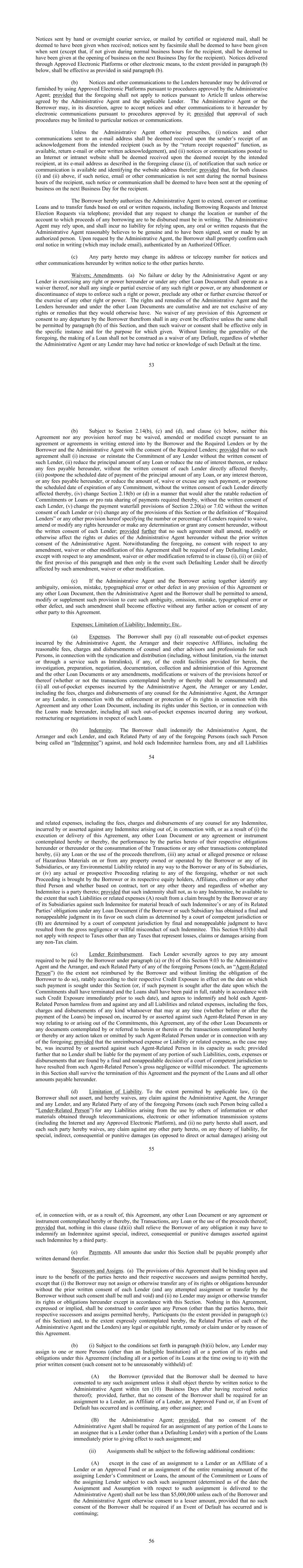53 Notices sent by hand or overnight courier service, or mailed by certified or registered mail, shall be deemed to have been given when received; notices sent by facsimile shall be deemed to have been given when sent (except that, if not given during normal business hours for the recipient, shall be deemed to have been given at the opening of business on the next Business Day for the recipient). Notices delivered through Approved Electronic Platforms or other electronic means, to the extent provided in paragraph (b) below, shall be effective as provided in said paragraph (b). (b) Notices and other communications to the Lenders hereunder may be delivered or furnished by using Approved Electronic Platforms pursuant to procedures approved by the Administrative Agent; provided that the foregoing shall not apply to notices pursuant to Article II unless otherwise agreed by the Administrative Agent and the applicable Lender. The Administrative Agent or the Borrower may, in its discretion, agree to accept notices and other communications to it hereunder by electronic communications pursuant to procedures approved by it; provided that approval of such procedures may be limited to particular notices or communications. Unless the Administrative Agent otherwise prescribes, (i) notices and other communications sent to an e-mail address shall be deemed received upon the sender’s receipt of an acknowledgement from the intended recipient (such as by the “return receipt requested” function, as available, return e-mail or other written acknowledgement), and (ii) notices or communications posted to an Internet or intranet website shall be deemed received upon the deemed receipt by the intended recipient, at its e-mail address as described in the foregoing clause (i), of notification that such notice or communication is available and identifying the website address therefor; provided that, for both clauses (i) and (ii) above, if such notice, email or other communication is not sent during the normal business hours of the recipient, such notice or communication shall be deemed to have been sent at the opening of business on the next Business Day for the recipient. The Borrower hereby authorizes the Administrative Agent to extend, convert or continue Loans and to transfer funds based on oral or written requests, including Borrowing Requests and Interest Election Requests via telephone; provided that any request to change the location or number of the account to which proceeds of any borrowing are to be disbursed must be in writing. The Administrative Agent may rely upon, and shall incur no liability for relying upon, any oral or written requests that the Administrative Agent reasonably believes to be genuine and to have been signed, sent or made by an authorized person. Upon request by the Administrative Agent, the Borrower shall promptly confirm each oral notice in writing (which may include email), authenticated by an Authorized Officer. (c) Any party hereto may change its address or telecopy number for notices and other communications hereunder by written notice to the other parties hereto. Waivers; Amendments. (a) No failure or delay by the Administrative Agent or any Lender in exercising any right or power hereunder or under any other Loan Document shall operate as a waiver thereof, nor shall any single or partial exercise of any such right or power, or any abandonment or discontinuance of steps to enforce such a right or power, preclude any other or further exercise thereof or the exercise of any other right or power. The rights and remedies of the Administrative Agent and the Lenders hereunder and under the other Loan Documents are cumulative and are not exclusive of any rights or remedies that they would otherwise have. No waiver of any provision of this Agreement or consent to any departure by the Borrower therefrom shall in any event be effective unless the same shall be permitted by paragraph (b) of this Section, and then such waiver or consent shall be effective only in the specific instance and for the purpose for which given. Without limiting the generality of the foregoing, the making of a Loan shall not be construed as a waiver of any Default, regardless of whether the Administrative Agent or any Lender may have had notice or knowledge of such Default at the time. 54 (b) Subject to Section 2.14(b), (c) and (d), and clause (c) below, neither this Agreement nor any provision hereof may be waived, amended or modified except pursuant to an agreement or agreements in writing entered into by the Borrower and the Required Lenders or by the Borrower and the Administrative Agent with the consent of the Required Lenders; provided that no such agreement shall (i) increase or reinstate the Commitment of any Lender without the written consent of such Lender, (ii) reduce the principal amount of any Loan or reduce the rate of interest thereon, or reduce any fees payable hereunder, without the written consent of each Lender directly affected thereby, (iii) postpone the scheduled date of payment of the principal amount of any Loan, or any interest thereon, or any fees payable hereunder, or reduce the amount of, waive or excuse any such payment, or postpone the scheduled date of expiration of any Commitment, without the written consent of each Lender directly affected thereby, (iv) change Section 2.18(b) or (d) in a manner that would alter the ratable reduction of Commitments or Loans or pro rata sharing of payments required thereby, without the written consent of each Lender, (v) change the payment waterfall provisions of Section 2.20(a) or 7.02 without the written consent of each Lender or (vi) change any of the provisions of this Section or the definition of “Required Lenders” or any other provision hereof specifying the number or percentage of Lenders required to waive, amend or modify any rights hereunder or make any determination or grant any consent hereunder, without the written consent of ea