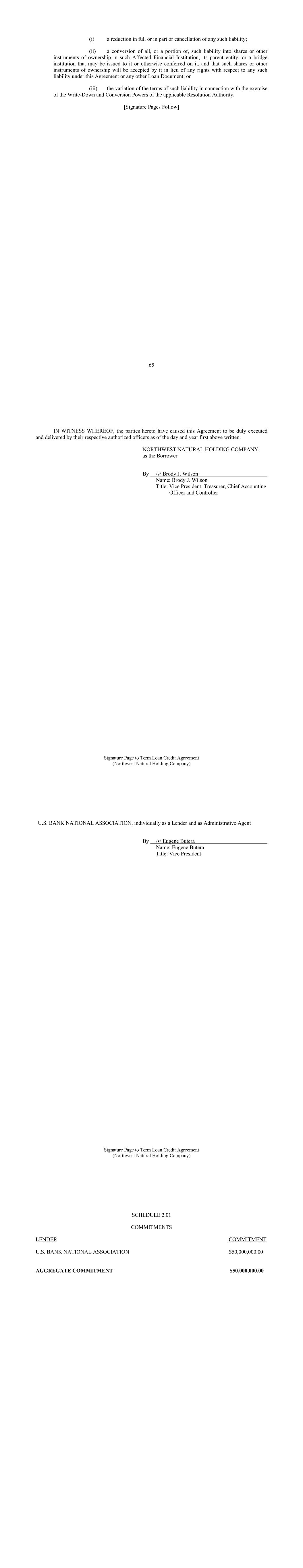 65 (i) a reduction in full or in part or cancellation of any such liability; (ii) a conversion of all, or a portion of, such liability into shares or other instruments of ownership in such Affected Financial Institution, its parent entity, or a bridge institution that may be issued to it or otherwise conferred on it, and that such shares or other instruments of ownership will be accepted by it in lieu of any rights with respect to any such liability under this Agreement or any other Loan Document; or (iii) the variation of the terms of such liability in connection with the exercise of the Write-Down and Conversion Powers of the applicable Resolution Authority. [Signature Pages Follow] Signature Page to Term Loan Credit Agreement (Northwest Natural Holding Company) IN WITNESS WHEREOF, the parties hereto have caused this Agreement to be duly executed and delivered by their respective authorized officers as of the day and year first above written. NORTHWEST NATURAL HOLDING COMPANY, as the Borrower By /s/ Brody J. Wilson Name: Brody J. Wilson Title: Vice President, Treasurer, Chief Accounting Officer and Controller Signature Page to Term Loan Credit Agreement (Northwest Natural Holding Company) U.S. BANK NATIONAL ASSOCIATION, individually as a Lender and as Administrative Agent By /s/ Eugene Butera Name: Eugene Butera Title: Vice President SCHEDULE 2.01 COMMITMENTS LENDER COMMITMENT U.S. BANK NATIONAL ASSOCIATION $50,000,000.00 AGGREGATE COMMITMENT $50,000,000.00