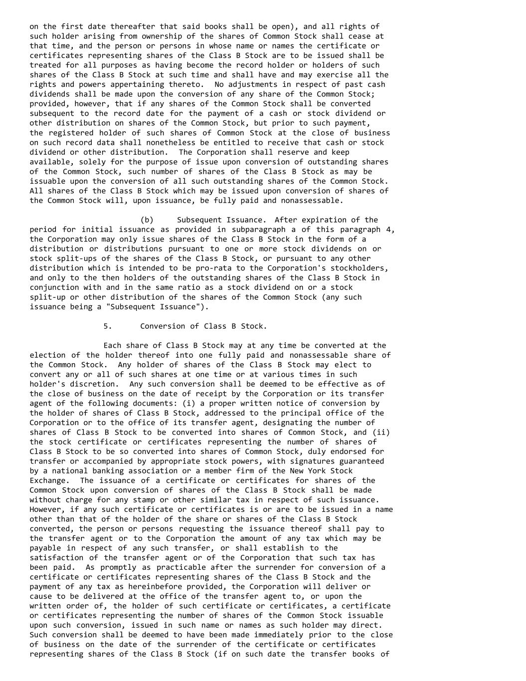 on the first date thereafter that said books shall be open), and all rights of such holder arising from ownership of the shares of Common Stock shall cease at that time, and the person or persons in whose name or names the certificate or certificates representing shares of the Class B Stock are to be issued shall be treated for all purposes as having become the record holder or holders of such shares of the Class B Stock at such time and shall have and may exercise all the rights and powers appertaining thereto. No adjustments in respect of past cash dividends shall be made upon the conversion of any share of the Common Stock; provided, however, that if any shares of the Common Stock shall be converted subsequent to the record date for the payment of a cash or stock dividend or other distribution on shares of the Common Stock, but prior to such payment, the registered holder of such shares of Common Stock at the close of business on such record data shall nonetheless be entitled to receive that cash or stock dividend or other distribution. The Corporation shall reserve and keep available, solely for the purpose of issue upon conversion of outstanding shares of the Common Stock, such number of shares of the Class B Stock as may be issuable upon the conversion of all such outstanding shares of the Common Stock. All shares of the Class B Stock which may be issued upon conversion of shares of the Common Stock will, upon issuance, be fully paid and nonassessable. (b) Subsequent Issuance. After expiration of the period for initial issuance as provided in subparagraph a of this paragraph 4, the Corporation may only issue shares of the Class B Stock in the form of a distribution or distributions pursuant to one or more stock dividends on or stock split-ups of the shares of the Class B Stock, or pursuant to any other distribution which is intended to be pro-rata to the Corporation's stockholders, and only to the then holders of the outstanding shares of the Class B Stock in conjunction with and in the same ratio as a stock dividend on or a stock split-up or other distribution of the shares of the Common Stock (any such issuance being a "Subsequent Issuance"). 5. Conversion of Class B Stock. Each share of Class B Stock may at any time be converted at the election of the holder thereof into one fully paid and nonassessable share of the Common Stock. Any holder of shares of the Class B Stock may elect to convert any or all of such shares at one time or at various times in such holder's discretion. Any such conversion shall be deemed to be effective as of the close of business on the date of receipt by the Corporation or its transfer agent of the following documents: (i) a proper written notice of conversion by the holder of shares of Class B Stock, addressed to the principal office of the Corporation or to the office of its transfer agent, designating the number of shares of Class B Stock to be converted into shares of Common Stock, and (ii) the stock certificate or certificates representing the number of shares of Class B Stock to be so converted into shares of Common Stock, duly endorsed for transfer or accompanied by appropriate stock powers, with signatures guaranteed by a national banking association or a member firm of the New York Stock Exchange. The issuance of a certificate or certificates for shares of the Common Stock upon conversion of shares of the Class B Stock shall be made without charge for any stamp or other similar tax in respect of such issuance. However, if any such certificate or certificates is or are to be issued in a name other than that of the holder of the share or shares of the Class B Stock converted, the person or persons requesting the issuance thereof shall pay to the transfer agent or to the Corporation the amount of any tax which may be payable in respect of any such transfer, or shall establish to the satisfaction of the transfer agent or of the Corporation that such tax has been paid. As promptly as practicable after the surrender for conversion of a certificate or certificates representing shares of the Class B Stock and the payment of any tax as hereinbefore provided, the Corporation will deliver or cause to be delivered at the office of the transfer agent to, or upon the written order of, the holder of such certificate or certificates, a certificate or certificates representing the number of shares of the Common Stock issuable upon such conversion, issued in such name or names as such holder may direct. Such conversion shall be deemed to have been made immediately prior to the close of business on the date of the surrender of the certificate or certificates representing shares of the Class B Stock (if on such date the transfer books of