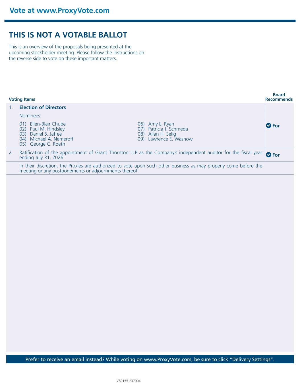 Vote at www.ProxyVote.com Prefer to receive an email instead? While voting on www.ProxyVote.com, be sure to click “Delivery Settings”. Voting Items Board Recommends V80155-P37904 1. Election of Directors For Nominees: 01) Ellen-Blair Chube 02) Paul M. Hindsley 03) Daniel S. Jaffee 04) Michael A. Nemeroff 05) George C. Roeth 06) Amy L. Ryan 07) Patricia J. Schmeda 08) Allan H. Selig 09) Lawrence E. Washow 2. Ratification of the appointment of Grant Thornton LLP as the Company’s independent auditor for the fiscal year ending July 31, 2026. For In their discretion, the Proxies are authorized to vote upon such other business as may properly come before the meeting or any postponements or adjournments thereof. THIS IS NOT A VOTABLE BALLOT This is an overview of the proposals being presented at the upcoming stockholder meeting. Please follow the instructions on the reverse side to vote on these important matters.