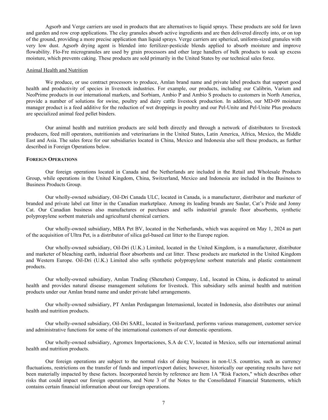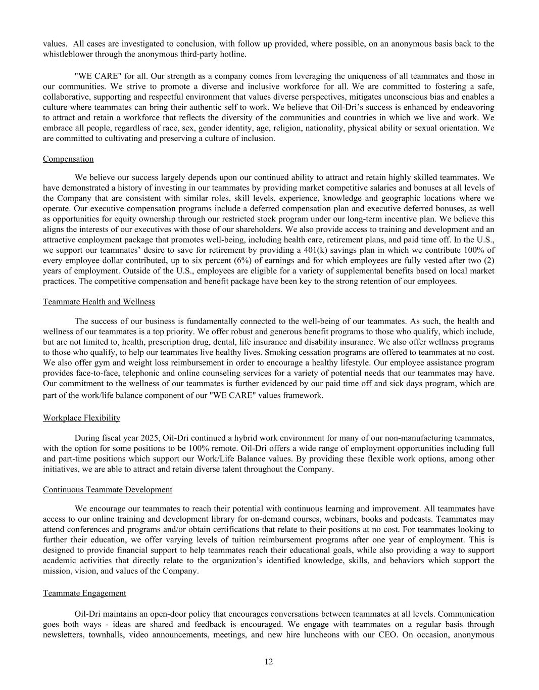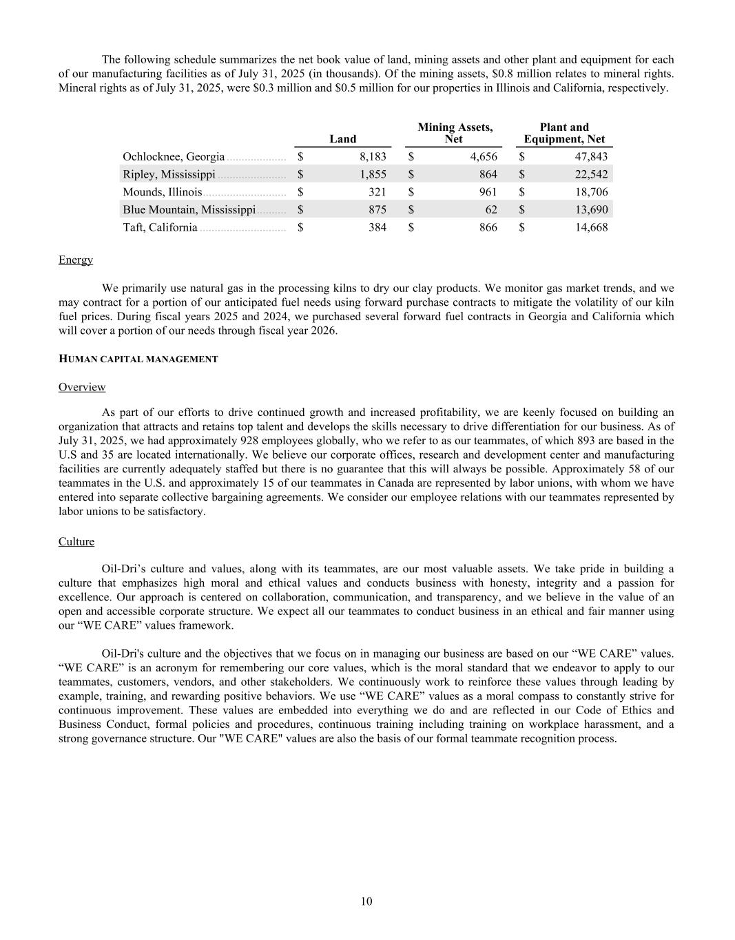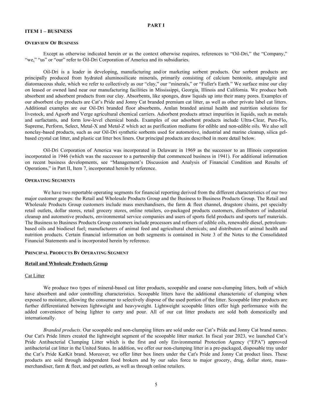 Dear Oil-Dri Stakeholder, Fiscal year 2025 was another record year for the Company and represented our third year of playing “Miney Ball” with fantastic results. What is Miney Ball you ask? It is Oil-Dri’s version of Money Ball, the data analytic methods employed by baseball general managers to help them make better lineup decisions for their teams. Miney Ball for us is all about making data-driven decisions. This approach has become a part of our culture and continues to drive measurable performance across the entire business. My father always said, “Everyone is entitled to their opinions, but they are not entitled to the facts.” How right he was! He also used to say, “Earnings are an opinion, cash is a fact.” These principles remain at the forefront of how we manage the Company. The team pulled together this year not only to deliver record sales and profits, but also robust cash generation. We began the year with over $23 million in cash and cash equivalents. During the past twelve-month period, we invested $33 million in capital expenditures, $8 million in dividends, and paid down $11 million of debt. Even with these significant outlays, we finished the year with over $50 million in cash and cash equivalents. I am grateful to our nearly 1,000 teammates worldwide who made these results a reality through their dedication and hard work. Our capital expenditures go toward maintaining and improving our plants, ensuring our teammates’ safety, allowing us to continue providing outstanding service to our customers and implementing growth and cost savings projects. Our facilities have never been in better shape and are the foundation on which current and future growth can be built. That said, our commitment to continuous improvement remains as strong as ever, and we plan to make significant investments in our infrastructure moving forward.” We head into fiscal year 2026 recognizing that the first six months of the fiscal year may be challenging from a year-over-year perspective due to our strong performance in the first half of 2025. However, while we do not give formal earnings guidance, our confidence remains high for the year as a whole. This outlook stems from the momentum we have built across the company. Our animal health business continues to expand with new trials and customers. The lightweight cat litter segment is growing as a percentage of the entire category, which bodes well for our lightweight brands and the private label lightweight litter products we manufacture for our retail partners. The same can be said for our crystal cat litter products. We are very pleased with the Ultra Pet Company, Inc. acquisition and fully expect to grow the business with branded and private label items. Our diverse mix of products, markets, customers, and channels continues to be a major source of strength for the Company. All businesses are working together to enable us to Create Value from Sorbent Minerals. As we begin our 85 year in business, I want to extend my sincere gratitude to our shareholders, customers, suppliers and Oil-Dri teammates who have helped us achieve this significant milestone. We are proud of our longevity and believe that the best is yet to come! th LETTER TO STAKEHOLDERS “OUR FACILITIES HAVE NEVER BEEN IN BETTER SHAPE AND ARE THE FOUNDATION ON WHICH CURRENT AND FUTURE GROWTH CAN BE BUILT.”