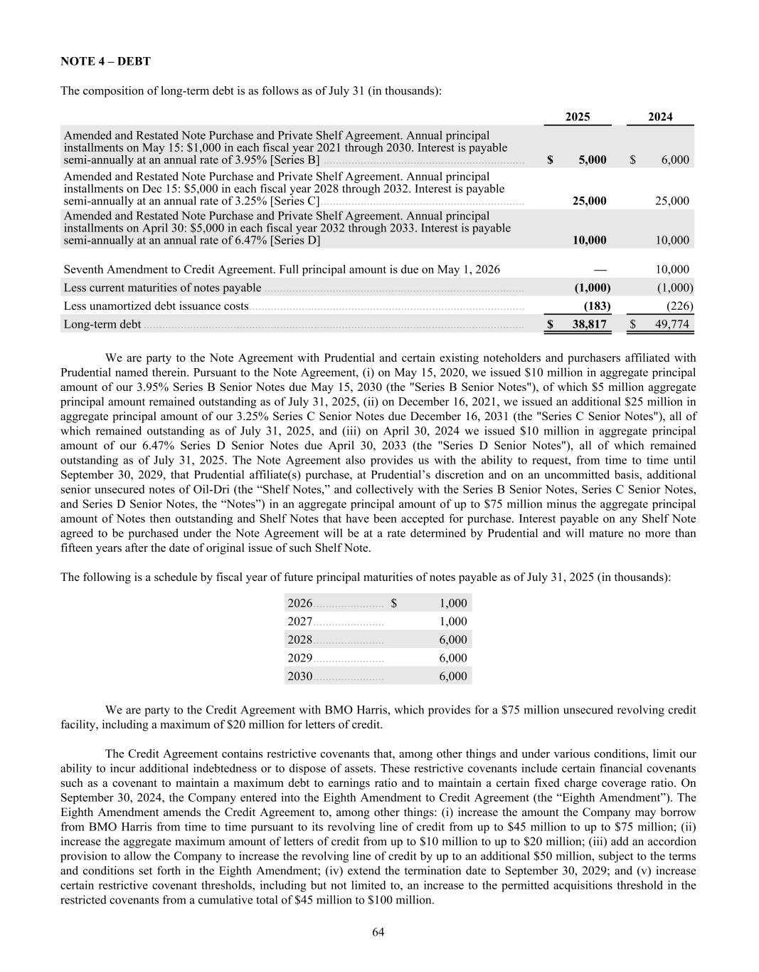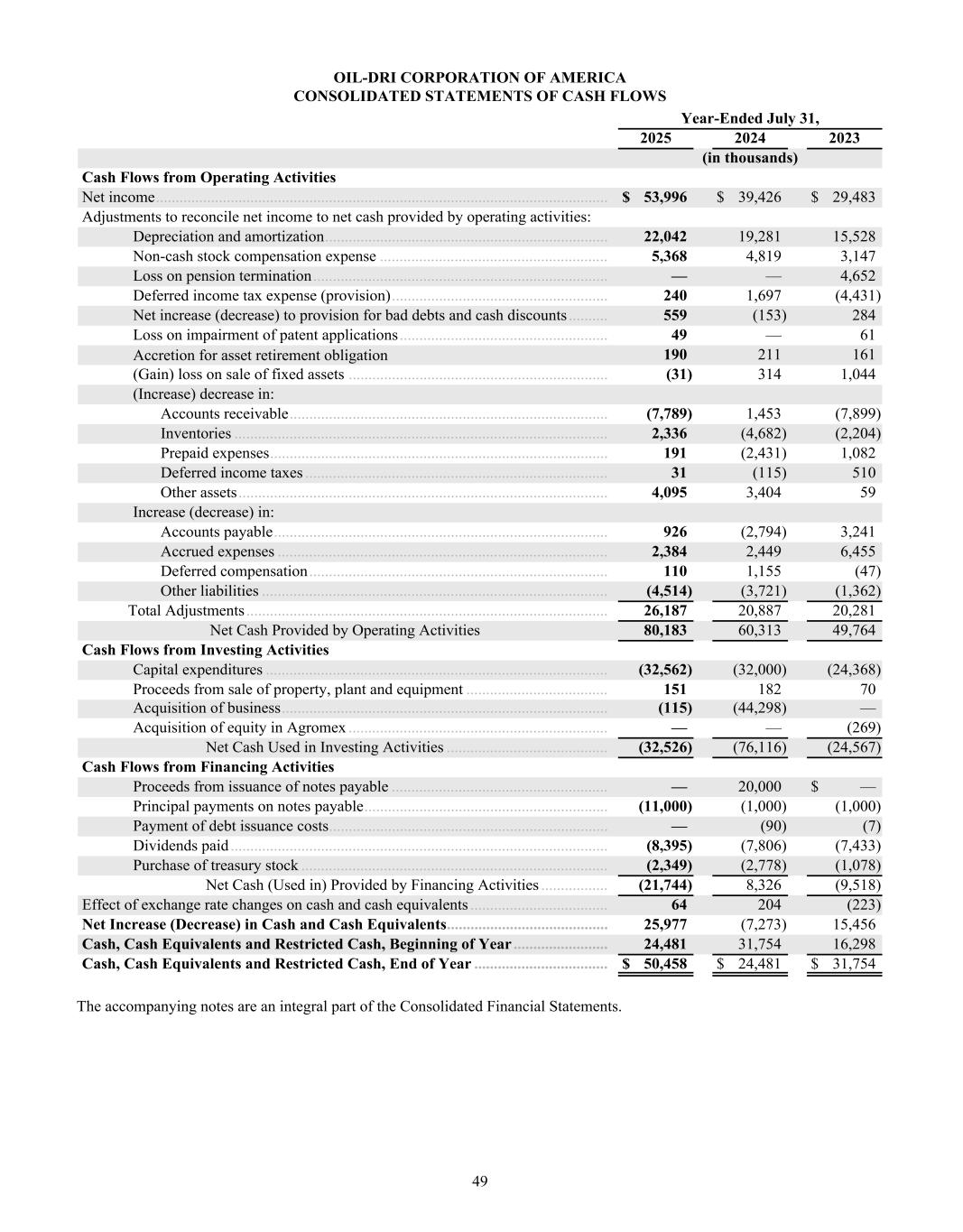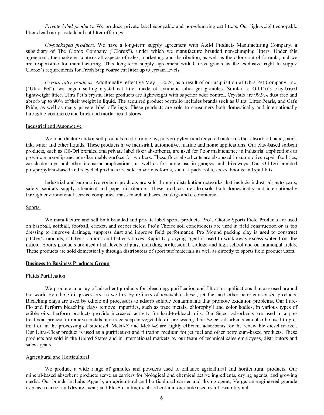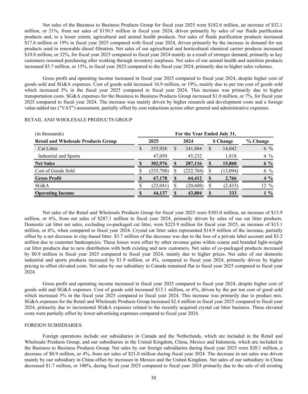 Dear Oil-Dri Stakeholder, Fiscal year 2025 was another record year for the Company and represented our third year of playing “Miney Ball” with fantastic results. What is Miney Ball you ask? It is Oil-Dri’s version of Money Ball, the data analytic methods employed by baseball general managers to help them make better lineup decisions for their teams. Miney Ball for us is all about making data-driven decisions. This approach has become a part of our culture and continues to drive measurable performance across the entire business. My father always said, “Everyone is entitled to their opinions, but they are not entitled to the facts.” How right he was! He also used to say, “Earnings are an opinion, cash is a fact.” These principles remain at the forefront of how we manage the Company. The team pulled together this year not only to deliver record sales and profits, but also robust cash generation. We began the year with over $23 million in cash and cash equivalents. During the past twelve-month period, we invested $33 million in capital expenditures, $8 million in dividends, and paid down $11 million of debt. Even with these significant outlays, we finished the year with over $50 million in cash and cash equivalents. I am grateful to our nearly 1,000 teammates worldwide who made these results a reality through their dedication and hard work. Our capital expenditures go toward maintaining and improving our plants, ensuring our teammates’ safety, allowing us to continue providing outstanding service to our customers and implementing growth and cost savings projects. Our facilities have never been in better shape and are the foundation on which current and future growth can be built. That said, our commitment to continuous improvement remains as strong as ever, and we plan to make significant investments in our infrastructure moving forward.” We head into fiscal year 2026 recognizing that the first six months of the fiscal year may be challenging from a year-over-year perspective due to our strong performance in the first half of 2025. However, while we do not give formal earnings guidance, our confidence remains high for the year as a whole. This outlook stems from the momentum we have built across the company. Our animal health business continues to expand with new trials and customers. The lightweight cat litter segment is growing as a percentage of the entire category, which bodes well for our lightweight brands and the private label lightweight litter products we manufacture for our retail partners. The same can be said for our crystal cat litter products. We are very pleased with the Ultra Pet Company, Inc. acquisition and fully expect to grow the business with branded and private label items. Our diverse mix of products, markets, customers, and channels continues to be a major source of strength for the Company. All businesses are working together to enable us to Create Value from Sorbent Minerals. As we begin our 85 year in business, I want to extend my sincere gratitude to our shareholders, customers, suppliers and Oil-Dri teammates who have helped us achieve this significant milestone. We are proud of our longevity and believe that the best is yet to come! th LETTER TO STAKEHOLDERS “OUR FACILITIES HAVE NEVER BEEN IN BETTER SHAPE AND ARE THE FOUNDATION ON WHICH CURRENT AND FUTURE GROWTH CAN BE BUILT.”
