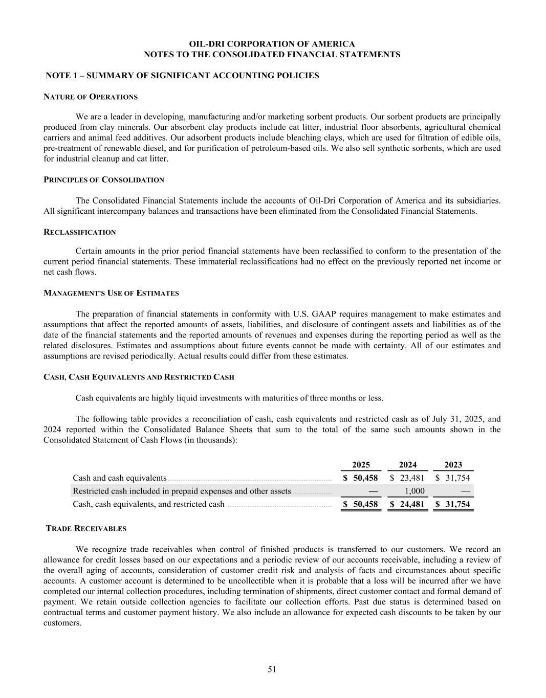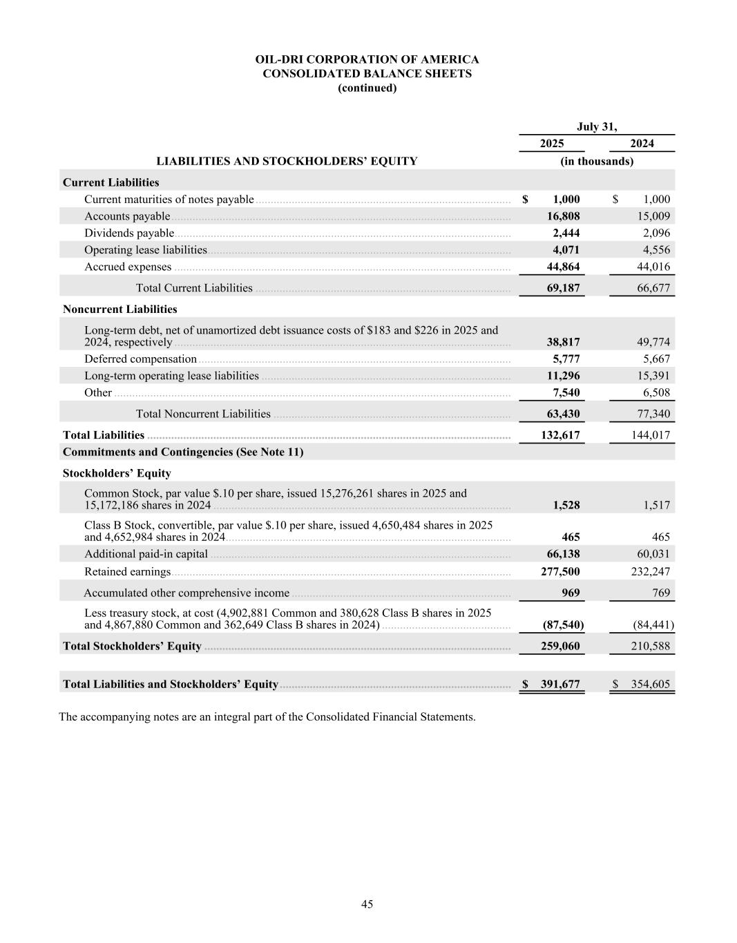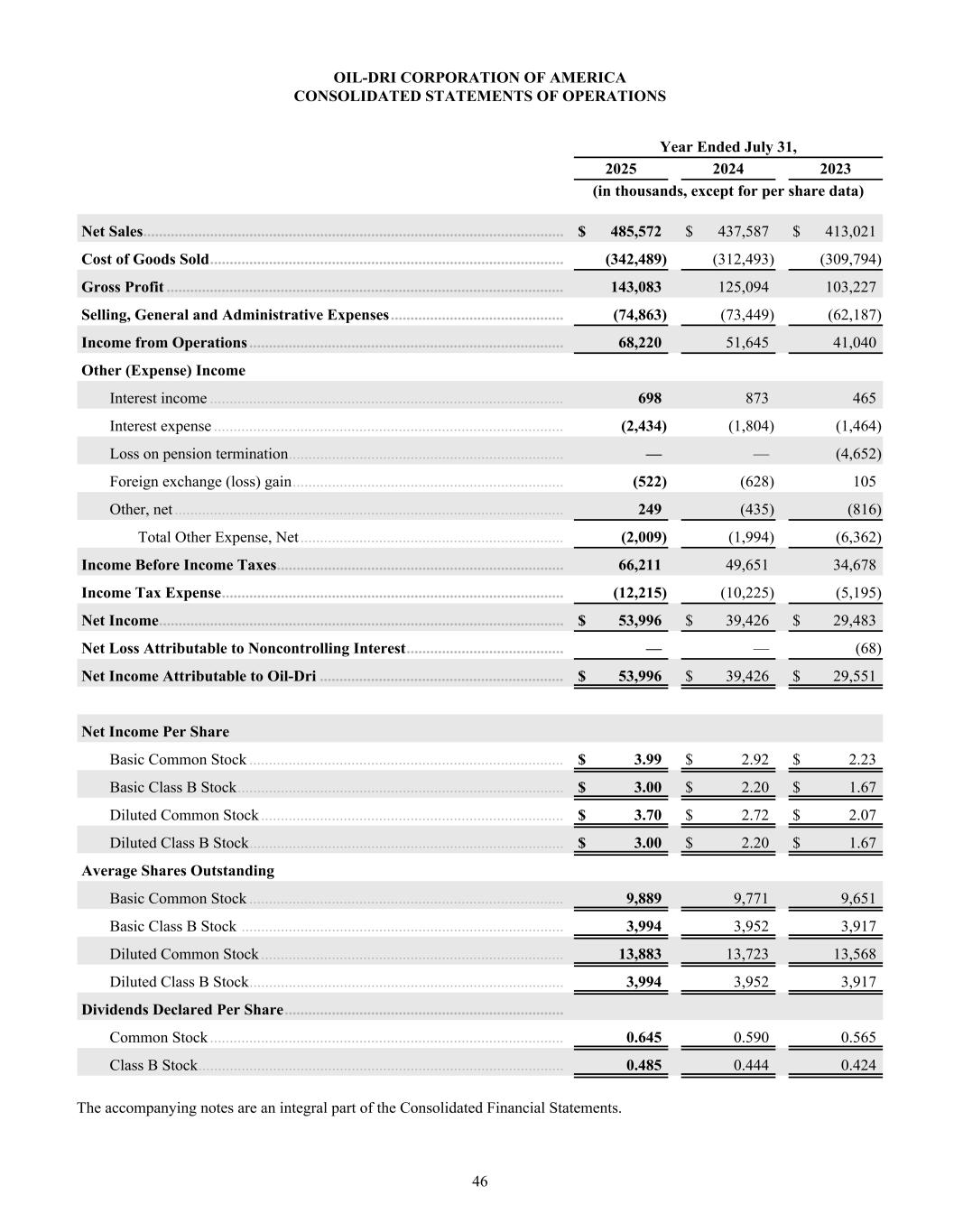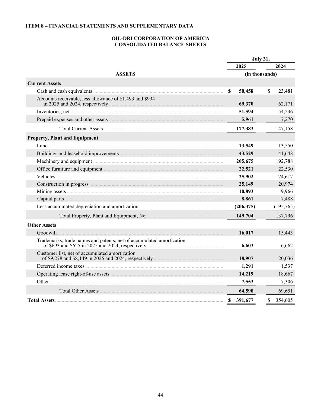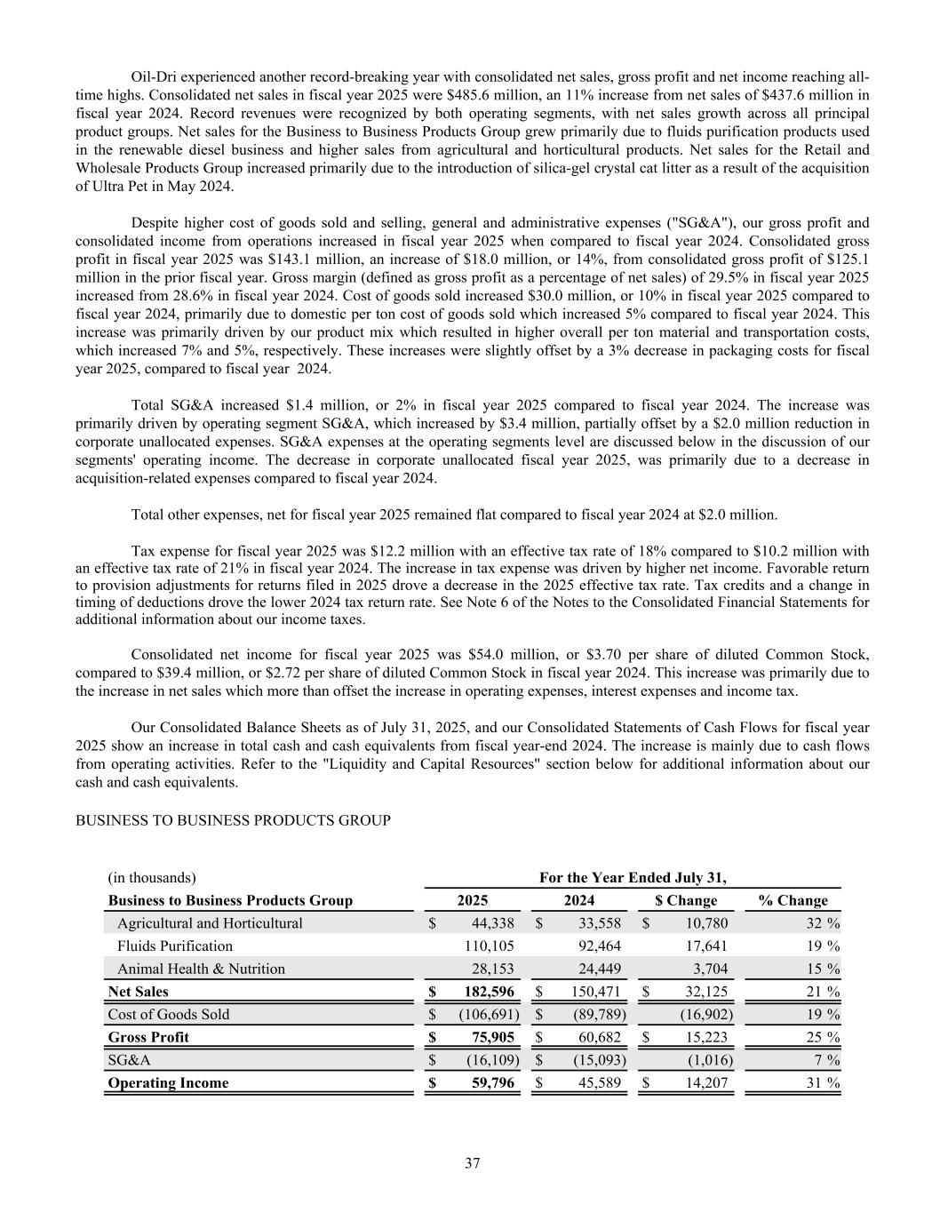 2023 2024 2025 $400 $450 $500 $550 $600 2023 2024 2025 $100 $120 $140 $160 $180 KEY METRICS BALANCE SHEET DATA NET SALES / TON GROSS PROFIT / TON INCOME STATEMENT DATA PER SHARE DATA* Return on Average Assets Return on Average Shareholder Equity Return on Invested Capital Cash and Cash Equivalents Total Assets Notes Payable Working Capital Net Sales Gross Profit Net Income Attributable to Oil-Dri Diluted Earnings per Share - Common Stock Paid Dividend per Share - Common Stock Book Value per Share † 2024 2024 2024 2024 2025 2025 2025 2025 2023 2023 2023 2023 12.3% 20.3% 14.3% $23,481 $354,605 $50,774 $80,481 $437,587 $125,094 $39,426 $2.72 $0.58 $14.43 14.5% 23.0% 17.3% $50,458 $391,677 $39,817 $108,196 $485,572 $143,083 $53,996 $3.70 $0.62 $17.69 11.0% 18.1% 15.7% $31,754 $286,235 $31,827 $77,739 $413,021 $103,227 $29,551 $2.07 $0.56 $12.27 FINANCIAL HIGHLIGHTS Fiscal Years End July 31 Dollar Amount in Thousands (Except Per Share Data) $509 $127 $566 $162 $599 $176 * Prior year per share data has been updated to reflect the 2-for-1 stock-split in January 2025. † Book Value per Share is based on total shares outstanding at the end of the fiscal year.