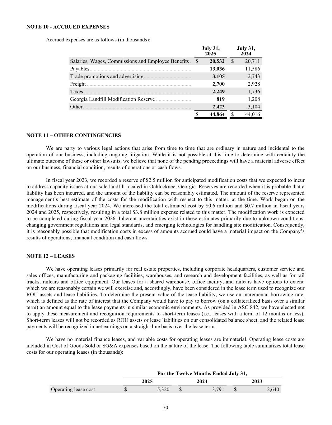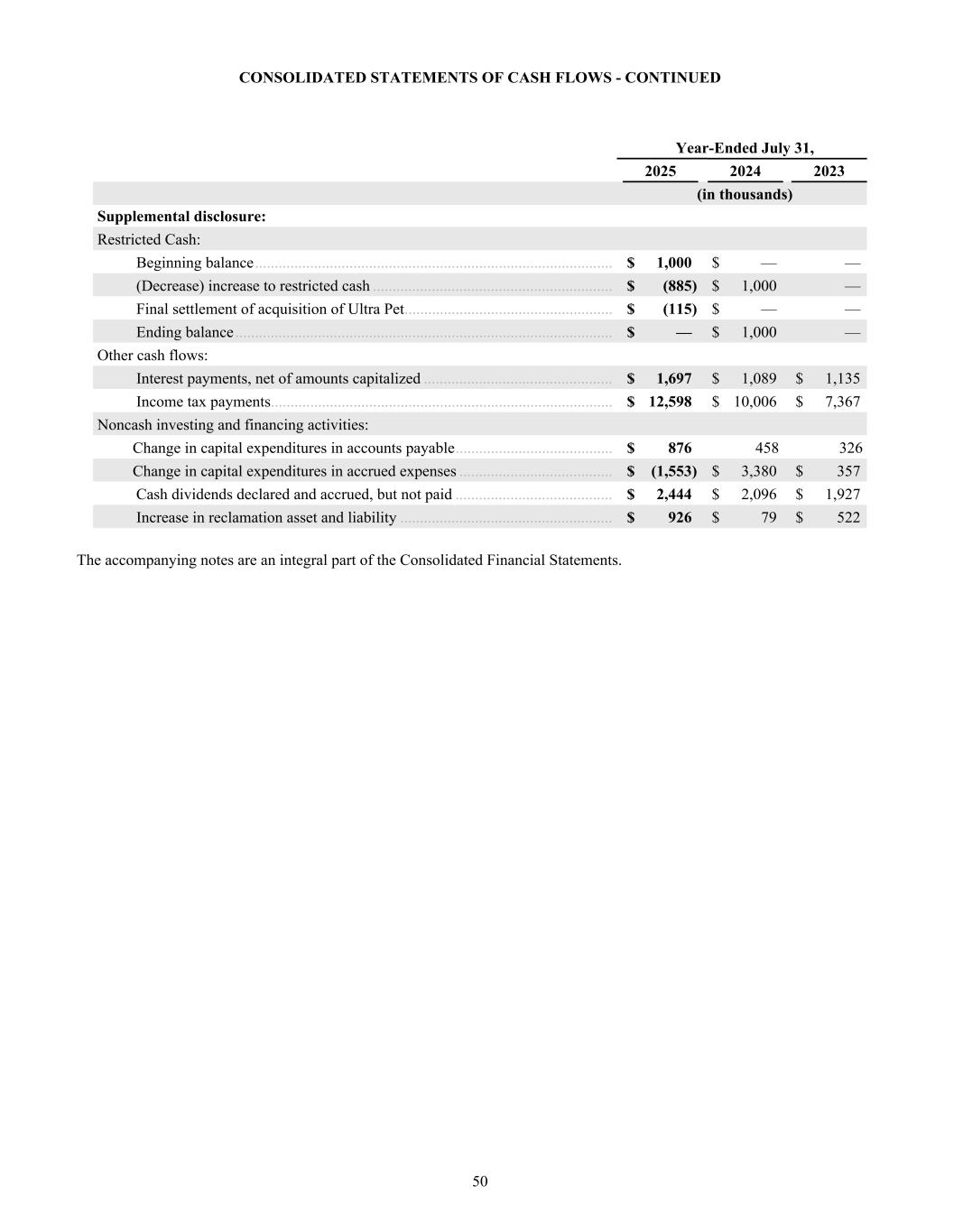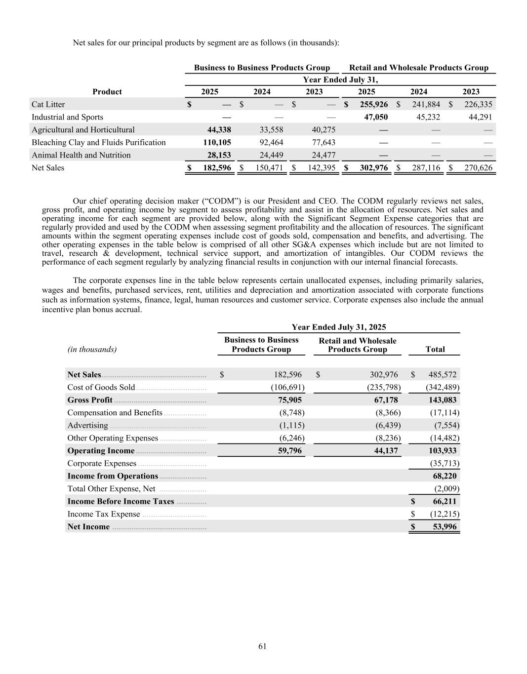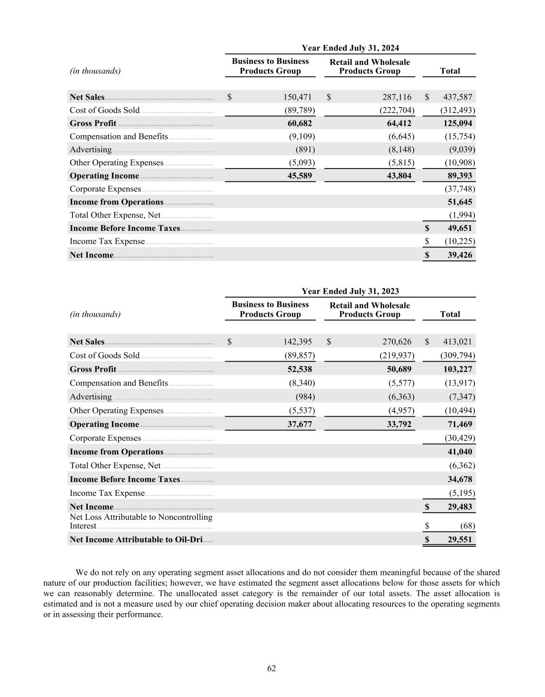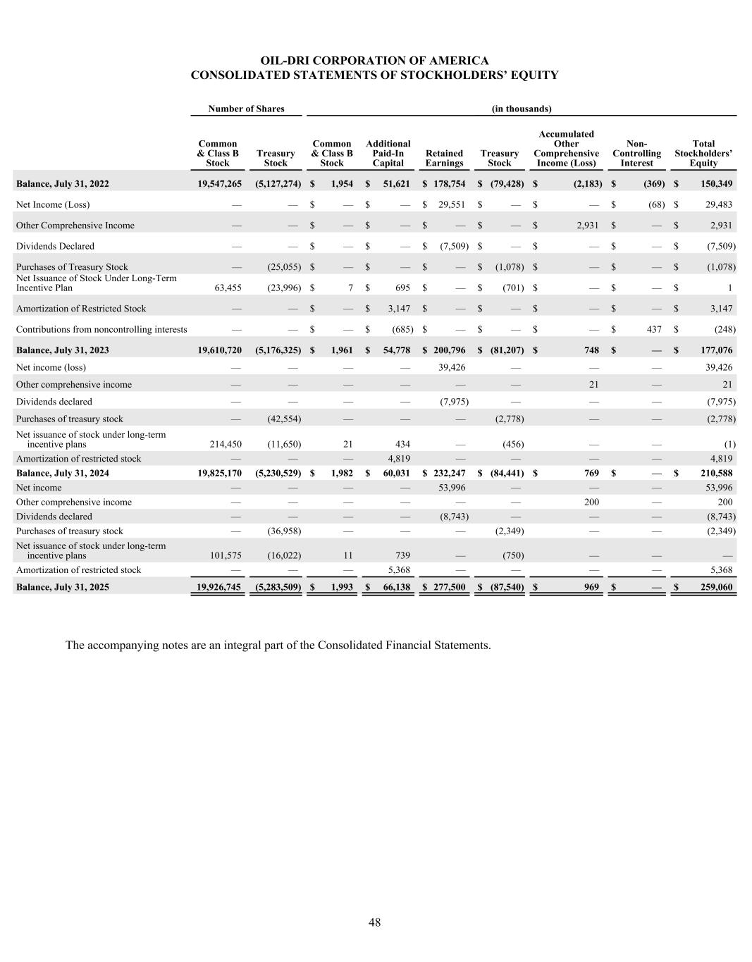 2023 2024 2025 $400 $450 $500 $550 $600 2023 2024 2025 $100 $120 $140 $160 $180 KEY METRICS BALANCE SHEET DATA NET SALES / TON GROSS PROFIT / TON INCOME STATEMENT DATA PER SHARE DATA* Return on Average Assets Return on Average Shareholder Equity Return on Invested Capital Cash and Cash Equivalents Total Assets Notes Payable Working Capital Net Sales Gross Profit Net Income Attributable to Oil-Dri Diluted Earnings per Share - Common Stock Paid Dividend per Share - Common Stock Book Value per Share † 2024 2024 2024 2024 2025 2025 2025 2025 2023 2023 2023 2023 12.3% 20.3% 14.3% $23,481 $354,605 $50,774 $80,481 $437,587 $125,094 $39,426 $2.72 $0.58 $14.43 14.5% 23.0% 17.3% $50,458 $391,677 $39,817 $108,196 $485,572 $143,083 $53,996 $3.70 $0.62 $17.69 11.0% 18.1% 15.7% $31,754 $286,235 $31,827 $77,739 $413,021 $103,227 $29,551 $2.07 $0.56 $12.27 FINANCIAL HIGHLIGHTS Fiscal Years End July 31 Dollar Amount in Thousands (Except Per Share Data) $509 $127 $566 $162 $599 $176 * Prior year per share data has been updated to reflect the 2-for-1 stock-split in January 2025. † Book Value per Share is based on total shares outstanding at the end of the fiscal year.