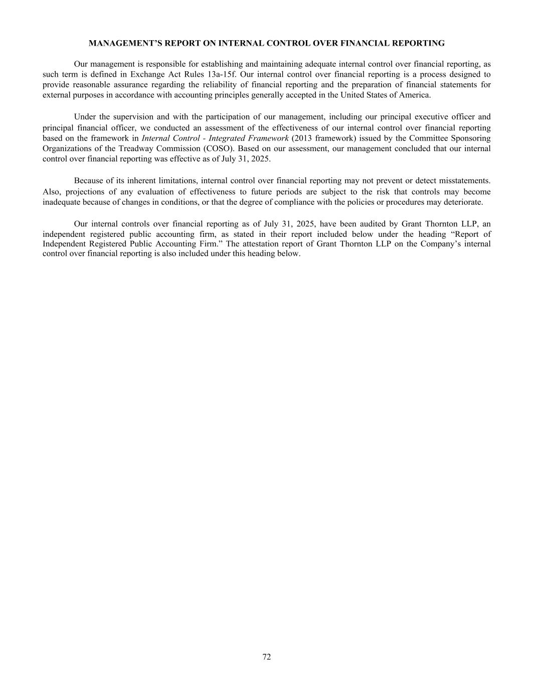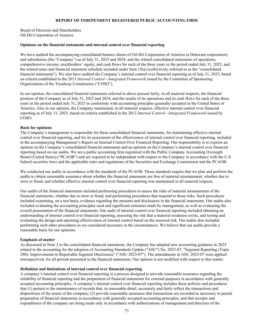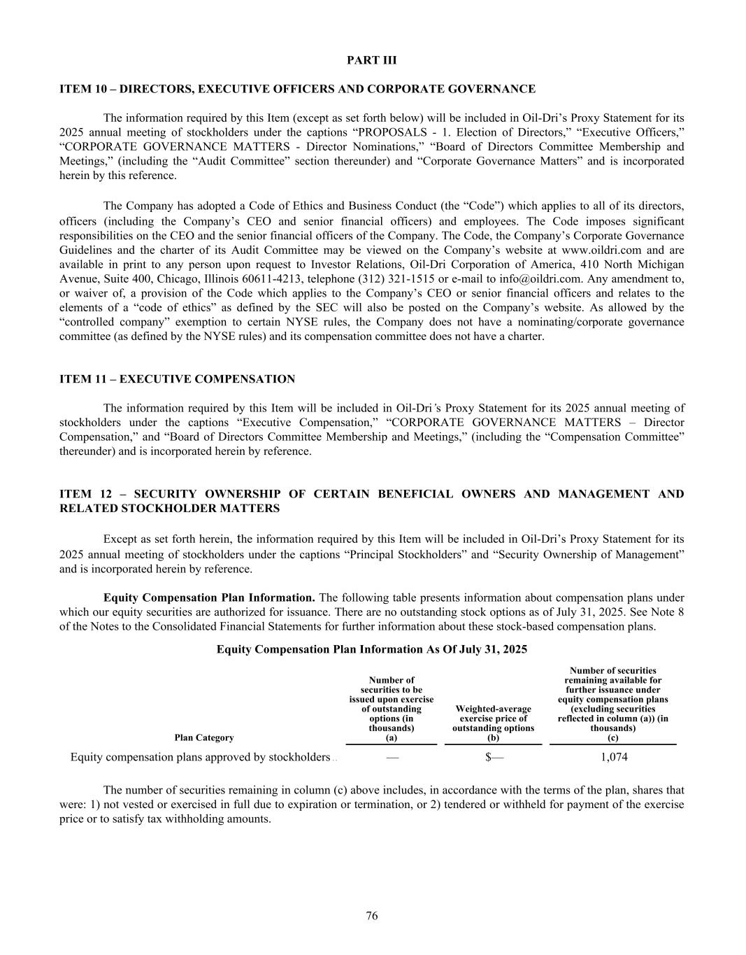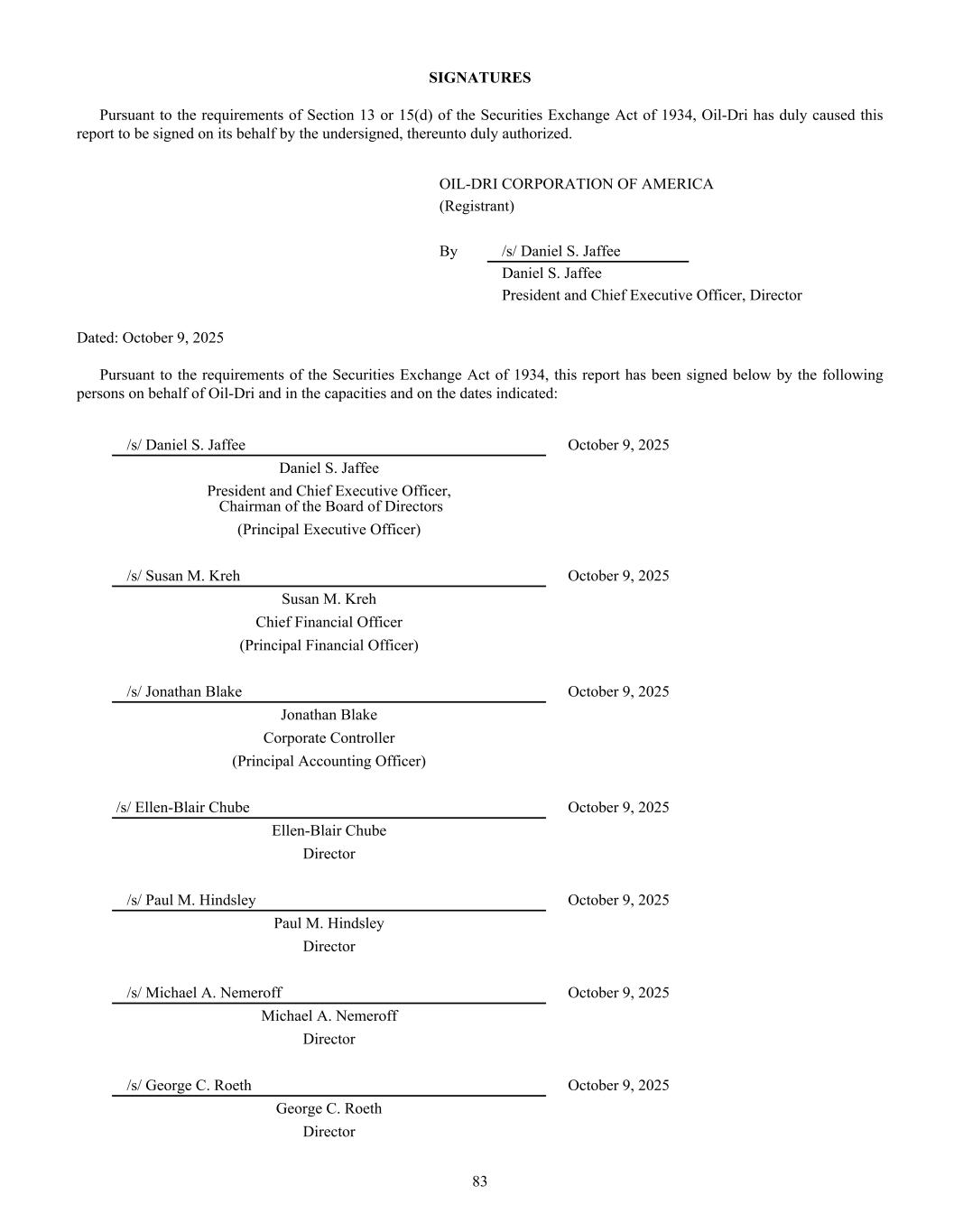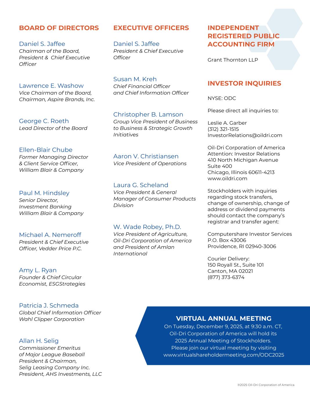 BOARD OF DIRECTORS Daniel S. Jaffee Chairman of the Board, President & Chief Executive Officer Lawrence E. Washow Vice Chairman of the Board, Chairman, Aspire Brands, Inc. George C. Roeth Lead Director of the Board Ellen-Blair Chube Former Managing Director & Client Service Officer, William Blair & Company Paul M. Hindsley Senior Director, Investment Banking William Blair & Company Michael A. Nemeroff President & Chief Executive Officer, Vedder Price P.C. Amy L. Ryan Founder & Chief Circular Economist, ESGStrategies Patricia J. Schmeda Global Chief Information Officer Wahl Clipper Corporation Allan H. Selig Commissioner Emeritus of Major League Baseball President & Chairman, Selig Leasing Company Inc. President, AHS Investments, LLC EXECUTIVE OFFICERS Daniel S. Jaffee President & Chief Executive Officer Susan M. Kreh Chief Financial Officer and Chief Information Officer Christopher B. Lamson Group Vice President of Business to Business & Strategic Growth Initiatives Aaron V. Christiansen Vice President of Operations Laura G. Scheland Vice President & General Manager of Consumer Products Division W. Wade Robey, Ph.D. Vice President of Agriculture, Oil-Dri Corporation of America and President of Amlan International INDEPENDENT REGISTERED PUBLIC ACCOUNTING FIRM Grant Thornton LLP INVESTOR INQUIRIES NYSE: ODC Please direct all inquiries to: Leslie A. Garber (312) 321-1515 InvestorRelations@oildri.com Oil-Dri Corporation of America Attention: Investor Relations 410 North Michigan Avenue Suite 400 Chicago, Illinois 60611-4213 www.oildri.com Stockholders with inquiries regarding stock transfers, change of ownership, change of address or dividend payments should contact the company’s registrar and transfer agent: Computershare Investor Services P.O. Box 43006 Providence, RI 02940-3006 Courier Delivery: 150 Royall St., Suite 101 Canton, MA 02021 (877) 373-6374 VIRTUAL ANNUAL MEETING On Tuesday, December 9, 2025, at 9:30 a.m. CT, Oil-Dri Corporation of America will hold its 2025 Annual Meeting of Stockholders. Please join our virtual meeting by visiting www.virtualshareholdermeeting.com/ODC2025 ®2025 Oil-Dri Corporation of America