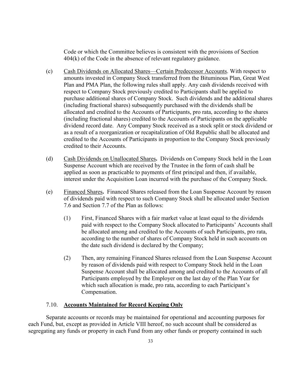 33 Code or which the Committee believes is consistent with the provisions of Section 404(k) of the Code in the absence of relevant regulatory guidance. (c) Cash Dividends on Allocated Shares—Certain Predecessor Accounts. With respect to amounts invested in Company Stock transferred from the Bituminous Plan, Great West Plan and PMA Plan, the following rules shall apply. Any cash dividends received with respect to Company Stock previously credited to Participants shall be applied to purchase additional shares of Company Stock. Such dividends and the additional shares (including fractional shares) subsequently purchased with the dividends shall be allocated and credited to the Accounts of Participants, pro rata, according to the shares (including fractional shares) credited to the Accounts of Participants on the applicable dividend record date. Any Company Stock received as a stock split or stock dividend or as a result of a reorganization or recapitalization of Old Republic shall be allocated and credited to the Accounts of Participants in proportion to the Company Stock previously credited to their Accounts. (d) Cash Dividends on Unallocated Shares. Dividends on Company Stock held in the Loan Suspense Account which are received by the Trustee in the form of cash shall be applied as soon as practicable to payments of first principal and then, if available, interest under the Acquisition Loan incurred with the purchase of the Company Stock. (e) Financed Shares. Financed Shares released from the Loan Suspense Account by reason of dividends paid with respect to such Company Stock shall be allocated under Section 7.6 and Section 7.7 of the Plan as follows: (1) First, Financed Shares with a fair market value at least equal to the dividends paid with respect to the Company Stock allocated to Participants’ Accounts shall be allocated among and credited to the Accounts of such Participants, pro rata, according to the number of shares of Company Stock held in such accounts on the date such dividend is declared by the Company; (2) Then, any remaining Financed Shares released from the Loan Suspense Account by reason of dividends paid with respect to Company Stock held in the Loan Suspense Account shall be allocated among and credited to the Accounts of all Participants employed by the Employer on the last day of the Plan Year for which such allocation is made, pro rata, according to each Participant’s Compensation. 7.10. Accounts Maintained for Record Keeping Only Separate accounts or records may be maintained for operational and accounting purposes for each Fund, but, except as provided in Article VIII hereof, no such account shall be considered as segregating any funds or property in each Fund from any other funds or property contained in such