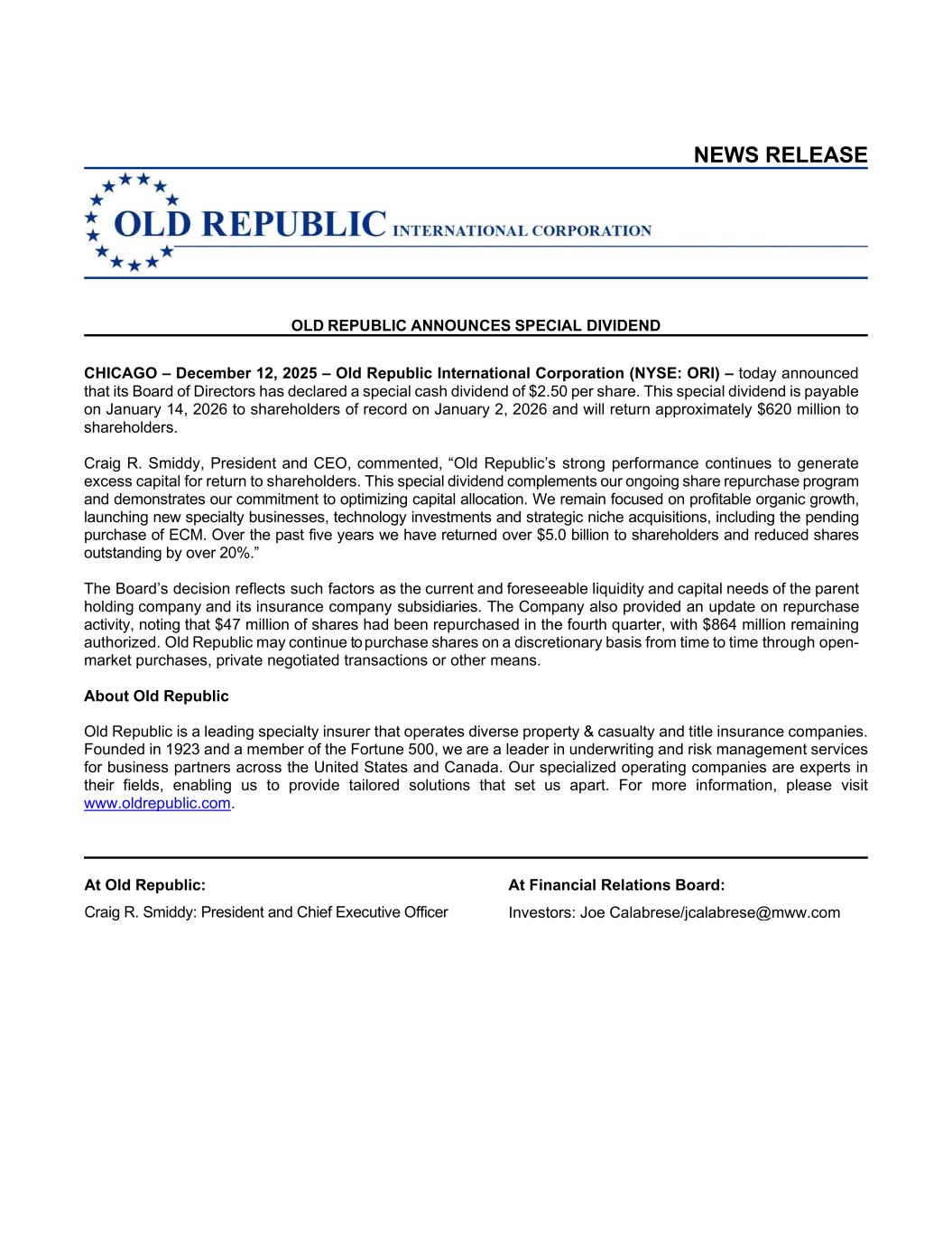 NEWS RELEASE OLD REPUBLIC ANNOUNCES SPECIAL DIVIDEND CHICAGO – December 12, 2025 – Old Republic International Corporation (NYSE: ORI) – today announced that its Board of Directors has declared a special cash dividend of $2.50 per share. This special dividend is payable on January 14, 2026 to shareholders of record on January 2, 2026 and will return approximately $620 million to shareholders. Craig R. Smiddy, President and CEO, commented, “Old Republic’s strong performance continues to generate excess capital for return to shareholders. This special dividend complements our ongoing share repurchase program and demonstrates our commitment to optimizing capital allocation. We remain focused on profitable organic growth, launching new specialty businesses, technology investments and strategic niche acquisitions, including the pending purchase of ECM. Over the past five years we have returned over $5.0 billion to shareholders and reduced shares outstanding by over 20%.” The Board’s decision reflects such factors as the current and foreseeable liquidity and capital needs of the parent holding company and its insurance company subsidiaries. The Company also provided an update on repurchase activity, noting that $47 million of shares had been repurchased in the fourth quarter, with $864 million remaining authorized. Old Republic may continue to purchase shares on a discretionary basis from time to time through open- market purchases, private negotiated transactions or other means. About Old Republic Old Republic is a leading specialty insurer that operates diverse property & casualty and title insurance companies. Founded in 1923 and a member of the Fortune 500, we are a leader in underwriting and risk management services for business partners across the United States and Canada. Our specialized operating companies are experts in their fields, enabling us to provide tailored solutions that set us apart. For more information, please visit www.oldrepublic.com. At Old Republic: At Financial Relations Board: Craig R. Smiddy: President and Chief Executive Officer Investors: Joe Calabrese/jcalabrese@mww.com