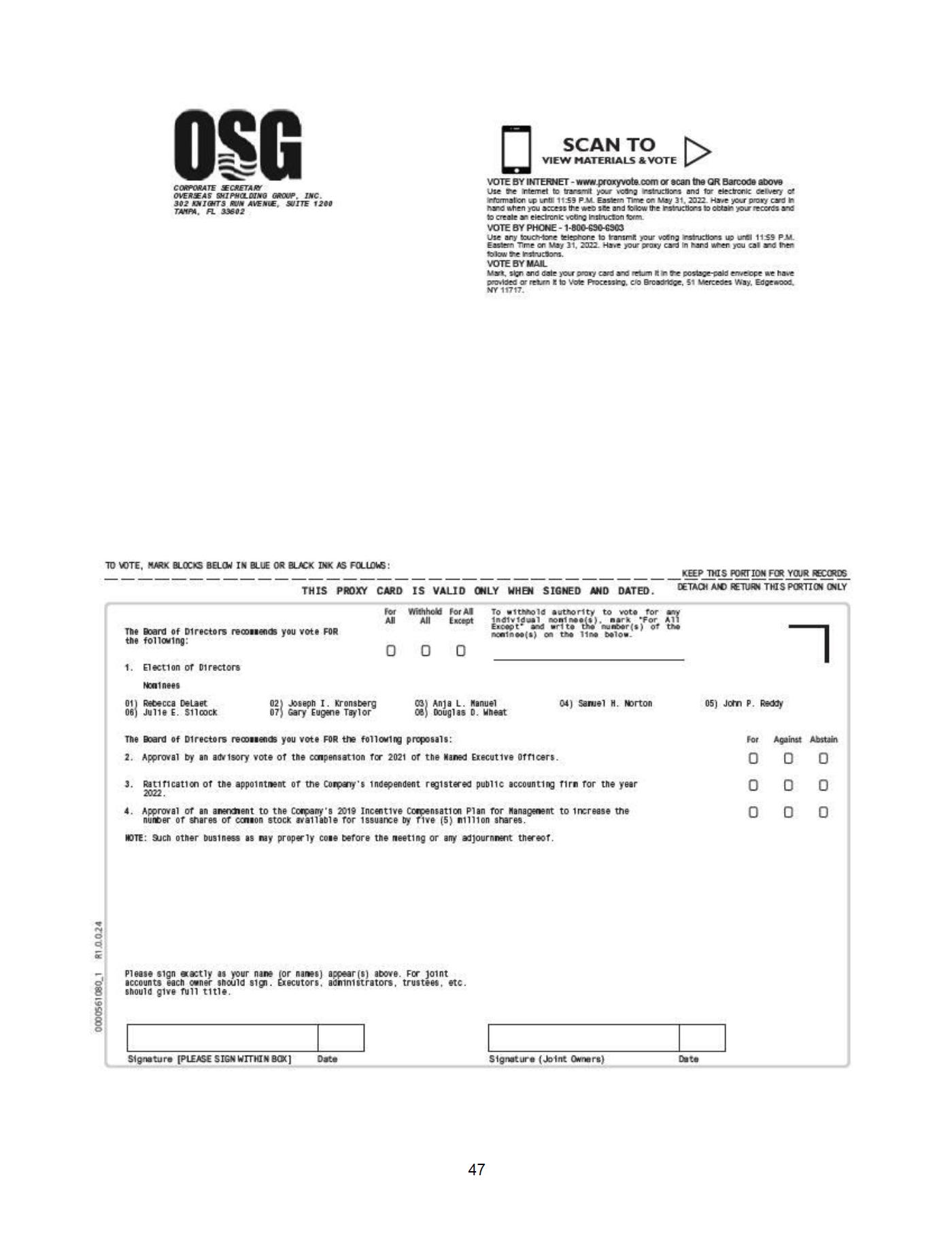 | ● | Internet Voting. You may use the Internet as described on the proxy card or the notice of availability of proxy materials, as applicable, to vote your shares of Common Stock by giving the Company a proxy. You will be able to vote your shares by the Internet and confirm that your vote has been properly recorded. Please see your proxy card or your notice of availability of proxy materials, as applicable, for specific instructions. | |