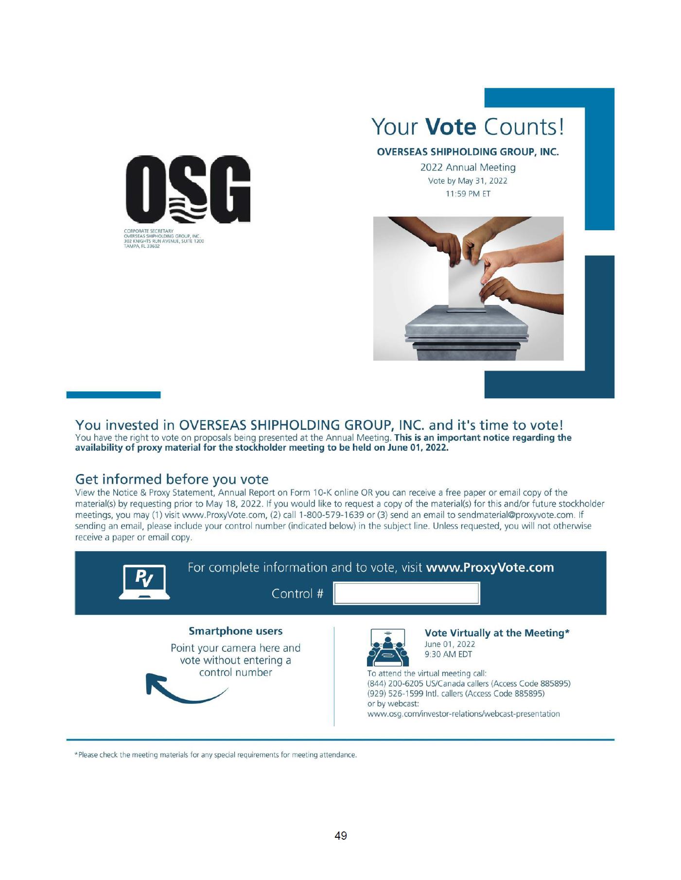 We urge you to vote as soon as possible by telephone or over the Internet. If you wish to vote on the date of the Annual Meeting or to change your vote, you may do so by sending an email to Investor-Relations@osg.com and attaching either your proxy card or your voting instruction form and the legal proxy provided by your bank, broker or other nominee. This information is necessary in order for your vote to be counted. Your email must be submitted by 9:35 a.m. (ET) on Wednesday, June 1, 2022.