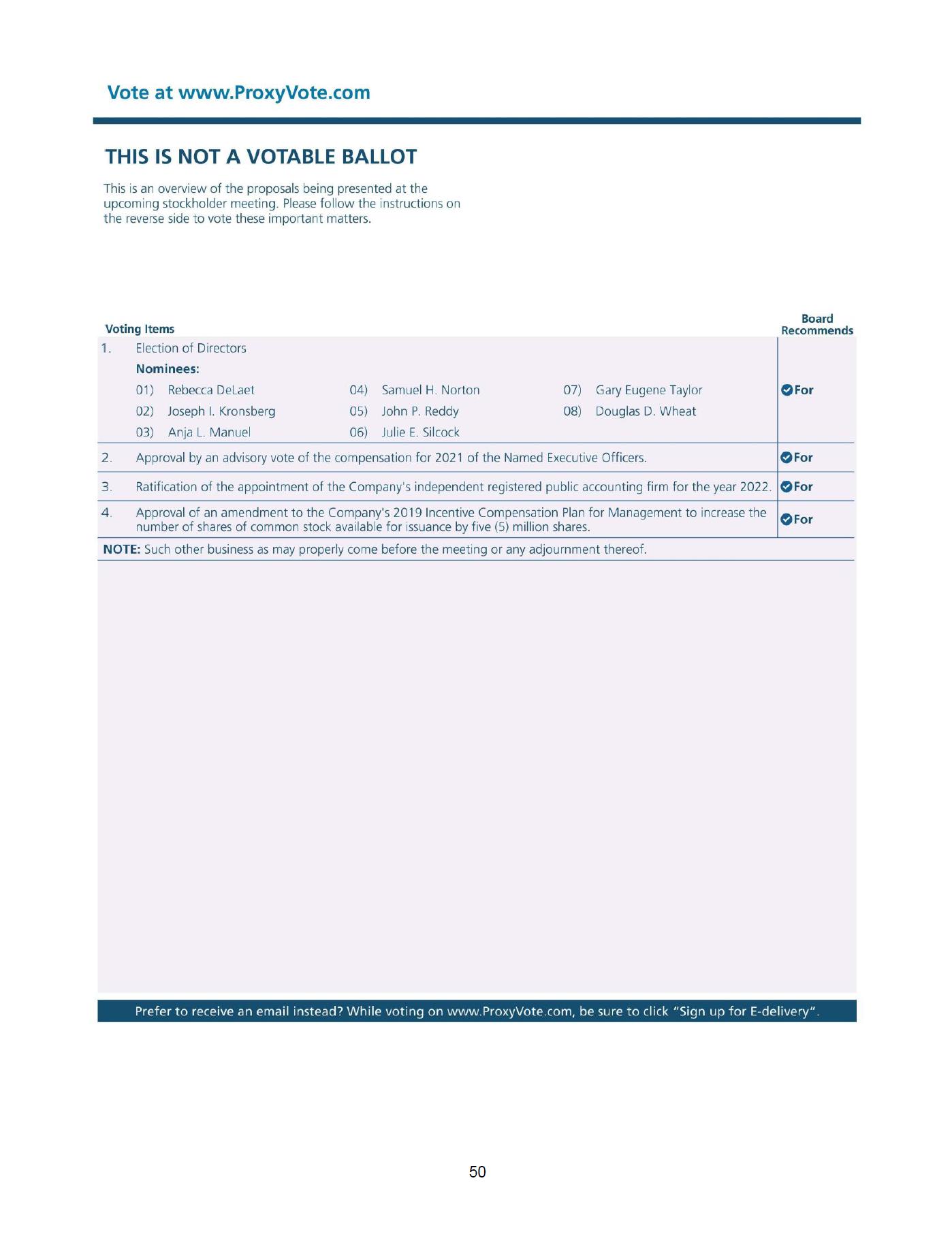 | (2) | to approve, on an advisory basis, the 2021 compensation for the Named Executive Officers in the Summary Compensation Table in the Proxy Statement; | |