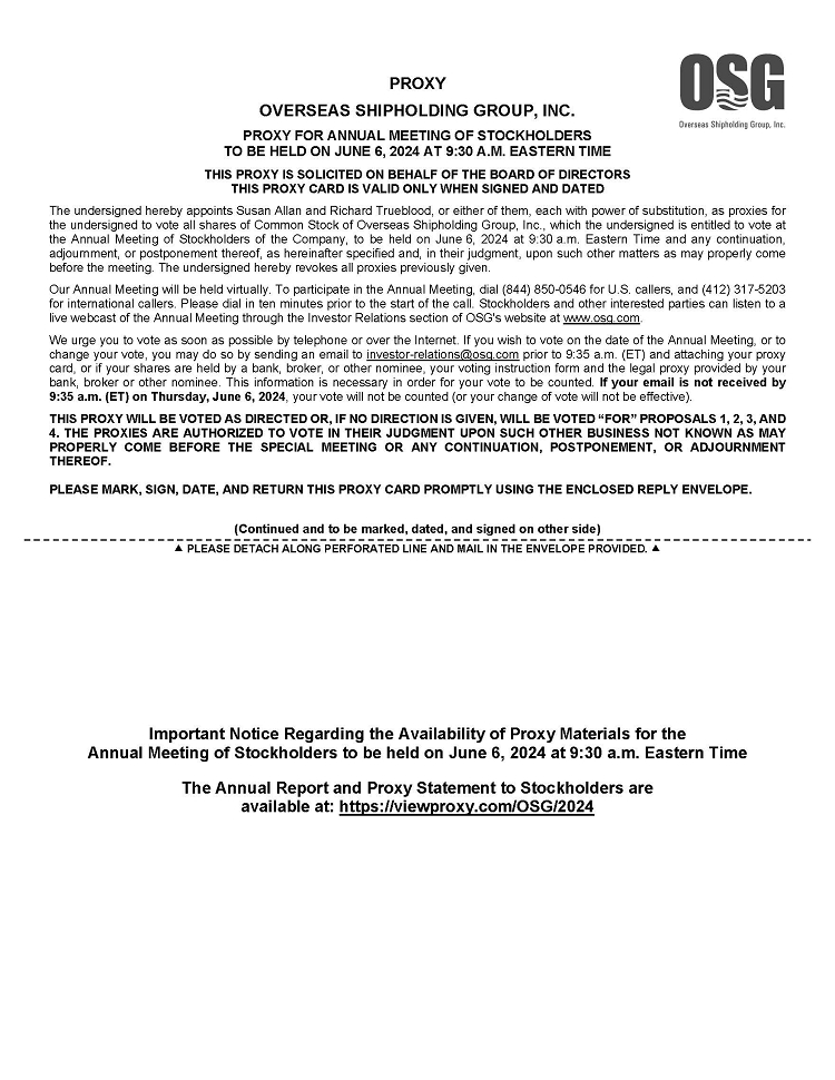 PROXY OVERSEAS SHIPHOLDING GROUP, INC. PROXY FOR ANNUAL MEETING OF STOCKHOLDERS TO BE HELD ON JUNE 6, 2024 AT 9:30 A.M. EASTERN TIME THIS PROXY IS SOLICITED ON BEHALF OF THE BOARD OF DIRECTORS THIS PROXY CARD IS VALID ONLY WHEN SIGNED AND DATED The undersigned hereby appoints Susan Allan and Richard Trueblood, or either of them, each with power of substitution, as proxies for the undersigned to vote all shares of Common Stock of Overseas Shipholding Group, Inc., which the undersigned is entitled to vote at the Annual Meeting of Stockholders of the Company, to be held on June 6, 2024 at 9:30 a.m. Eastern Time and any continuation, adjournment, or postponement thereof, as hereinafter specified and, in their judgment, upon such other matters as may properly come before the meeting. The undersigned hereby revokes all proxies previously given. Our Annual Meeting will be held virtually. To participate in the Annual Meeting, dial (844) 850-0546 for U.S. callers, and (412) 317-5203 for international callers. Please dial in ten minutes prior to the start of the call. Stockholders and other interested parties can listen to a live webcast of the Annual Meeting through the Investor Relations section of OSG's website at www.osg.com. We urge you to vote as soon as possible by telephone or over the Internet. If you wish to vote on the date of the Annual Meeting, or to change your vote, you may do so by sending an email to investor-relations@osg.com prior to 9:35 a.m. (ET) and attaching your proxy card, or if your shares are held by a bank, broker, or other nominee, your voting instruction form and the legal proxy provided by your bank, broker or other nominee. This information is necessary in order for your vote to be counted. If your email is not received by 9:35 a.m. (ET) on Thursday, June 6, 2024, your vote will not be counted (or your change of vote will not be effective). THIS PROXY WILL BE VOTED AS DIRECTED OR, IF NO DIRECTION IS GIVEN, WILL BE VOTED “FOR” PROPOSALS 1, 2, 3, AND 4. THE PROXIES ARE AUTHORIZED TO VOTE IN THEIR JUDGMENT UPON SUCH OTHER BUSINESS NOT KNOWN AS MAY PROPERLY COME BEFORE THE SPECIAL MEETING OR ANY CONTINUATION, POSTPONEMENT, OR ADJOURNMENT THEREOF. PLEASE MARK, SIGN, DATE, AND RETURN THIS PROXY CARD PROMPTLY USING THE ENCLOSED REPLY ENVELOPE. (Continued and to be marked, dated, and signed on other side) . PLEASE DETACH ALONG PERFORATED LINE AND MAIL IN THE ENVELOPE PROVIDED. • Important Notice Regarding the Availability of Proxy Materials for the Annual Meeting of Stockholders to be held on June 6, 2024 at 9:30 a.m. Eastern Time The Annual Report and Proxy Statement to Stockholders are available at: https://viewproxy.com/OSG/2024 Please mark your votes like this .