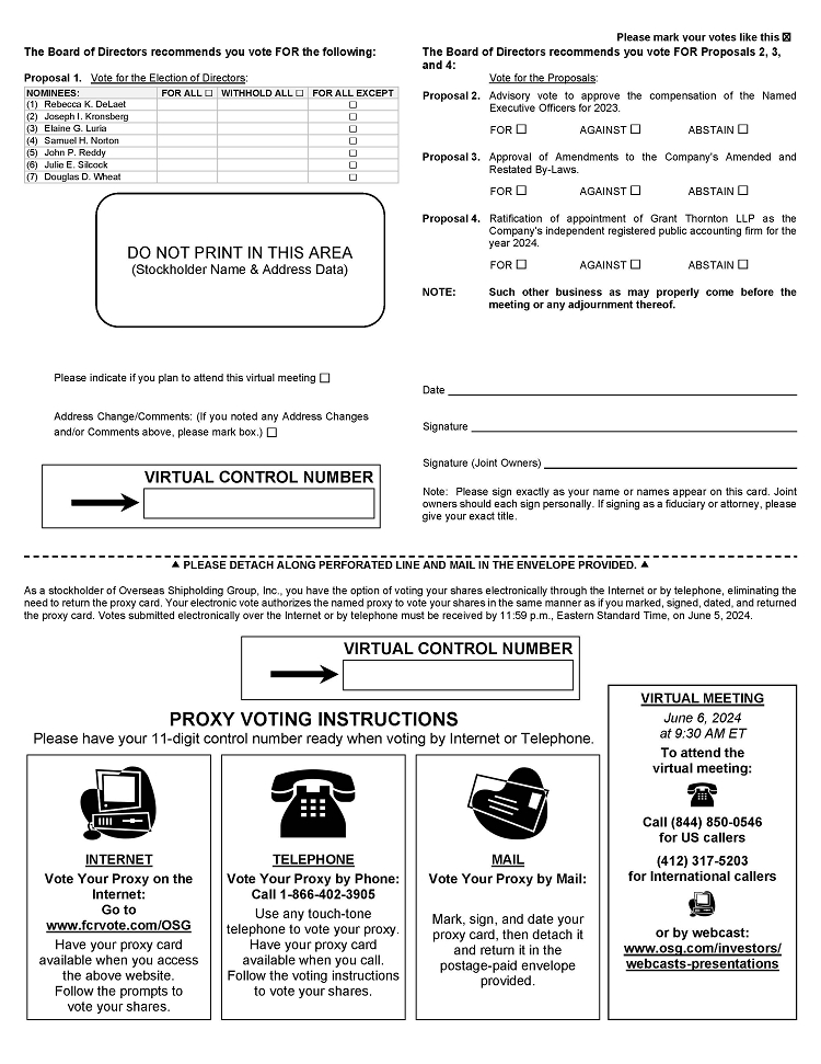 The Board of Directors recommends you vote FOR the following: The Board of Directors recommends you vote FOR Proposals 2, 3, and 4: Proposal 1. Vote for the Election of Directors: Vote for the Proposals: NOMINEES: FOR ALL . WITHHOLD ALL . FOR ALL EXCEPT (1) Rebecca K. DeLaet . (2) Joseph I. Kronsberg . (3) Elaine G. Luria . (4) Samuel H. Norton . (5) John P. Reddy . (6) Julie E. Silcock .. (7) Douglas D. Wheat . DO NOT PRINT IN THIS AREA (Stockholder Name & Address Data) Please indicate if you plan to attend this virtual meeting . Address Change/Comments: (If you noted any Address Changes and/or Comments above, please mark box.) . VIRTUAL CONTROL NUMBER Proposal 2. Advisory vote to approve the compensation of the Named Executive Officers for 2023. FOR . AGAINST . ABSTAIN . Proposal 3. Approval of Amendments to the Company's Amended and Restated By-Laws. FOR . AGAINST . ABSTAIN .. Proposal 4. Ratification of appointment of Grant Thornton LLP as the NOTE: Company's independent registered public accounting firm for the year 2024. FOR . AGAINST . ABSTAIN . Such other business as may properly come before the meeting or any adjournment thereof. Date Signature Signature (Joint Owners) Note: Please sign exactly as your name or names appear on this card. Joint owners should each sign personally. If signing as a fiduciary or attorney, please give your exact title. . PLEASE DETACH ALONG PERFORATED LINE AND MAIL IN THE ENVELOPE PROVIDED. • As a stockholder of Overseas Shipholding Group, Inc., you have the option of voting your shares electronically through the Internet or by telephone, eliminating the need to return the proxy card. Your electronic vote authorizes the named proxy to vote your shares in the same manner as if you marked, signed, dated, and returned the proxy card. Votes submitted electronically over the Internet or by telephone must be received by 11:59 p.m., Eastern Standard Time, on June 5, 2024. VIRTUAL CONTROL NUMBER VIRTUAL MEETING PROXY VOTING INSTRUCTIONS June 6, 2024 at 9:30 AM ETPlease have your 11-digit control number ready when voting by Internet or Telephone. To attend the virtual meeting: INTERNET Vote Your Proxy on the Internet: Go to www.fcrvote.com/OSG Have your proxy card available when you access TELEPHONE Vote Your Proxy by Phone: Call 1-866-402-3905 Use any touch-tone telephone to vote your proxy. Have your proxy card available when you call. Follow the voting instructions MAIL Vote Your Proxy by Mail: Mark, sign, and date your proxy card, then detach it and return it in the postage-paid envelope provided. Call (844) 850-0546 for US callers (412) 317-5203 for International callers or by webcast: www.osg.com/investors/ webcasts-presentations the above website. Follow the prompts to vote your shares. to vote your shares.