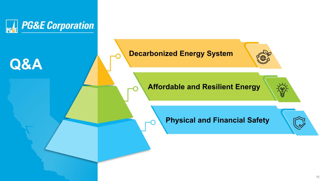 15…And Providing Differentiated Growth For Investors Investing In California’s Prosperity… Commitment to California’s Prosperity and Growth 10% 12% 11% 10% 9% 9% 9% 9% 9% 22A 23A 24A 25F 26F 27F 28F 29F 30F $B 0.9 1.2 1.7 2.0 2.9 PG&E 2024 PG&E 2025F PG&E 2030F 2024 Peer Avg 2024 Peer Top Decile Premium Growth Capital to Expense Ratio3 ~9% Avg Annual Growth Rate Base Non-GAAP Core EPS2 + DPS Growth 75 81 89 96 106 26F 27F 28F 29F 30F Endnotes are included in the Appendix 5-Year Capital Plan (2026-2030) invests $73B in California, supporting grid safety and reliability, while keeping affordability top of mind Critical partner to California, the world's 4th largest economy,1 delivering energy and driving economic growth and development Powering California’s expanding grid — 20 GWs mainly battery storage and solar added statewide since 2020 Collaborating with other utilities and local and state agencies to prevent, forecast, and improve response protocols for emergencies