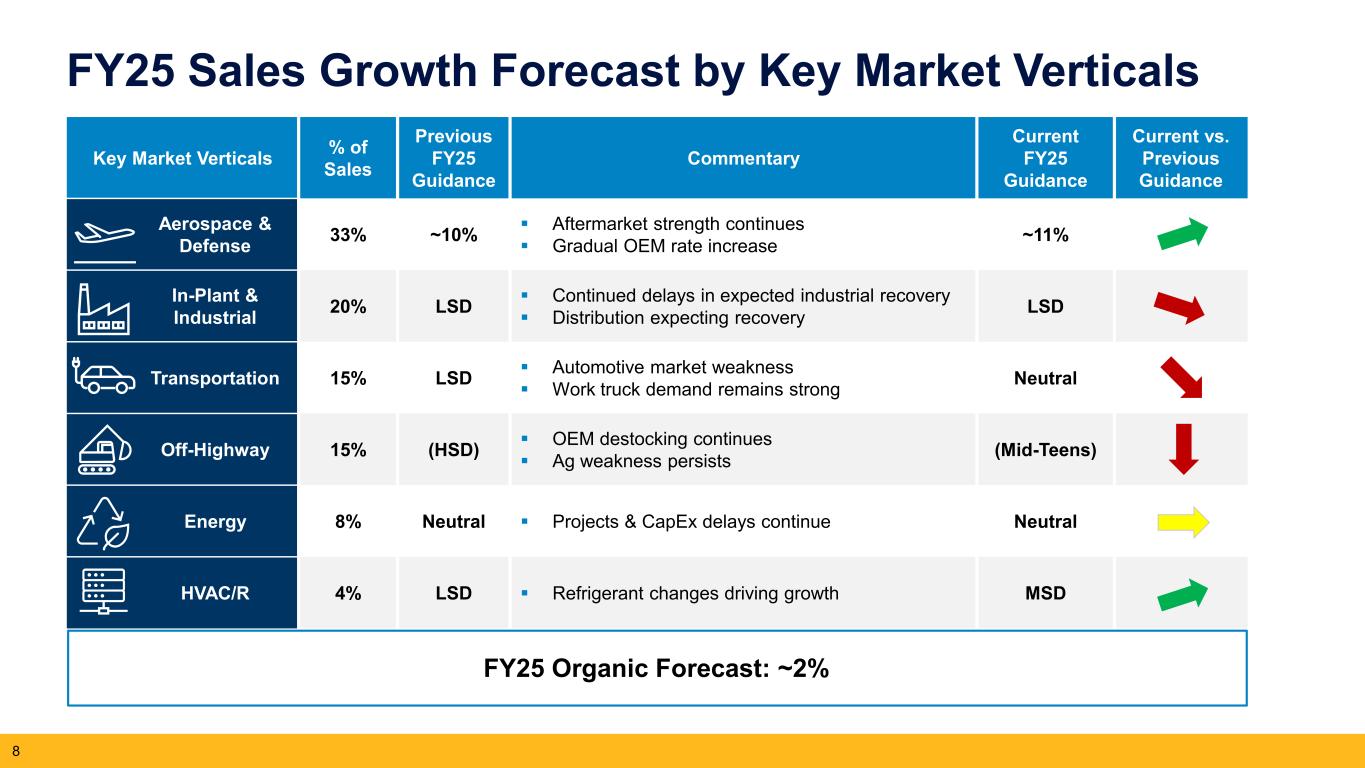 Key Market Verticals % of Sales Previous FY25 Guidance Commentary Current FY25 Guidance Current vs. Previous Guidance Aerospace & Defense 33% ~10% Aftermarket strength continues Gradual OEM rate increase ~11% In-Plant & Industrial 20% LSD Continued delays in expected industrial recovery Distribution expecting recovery LSD Transportation 15% LSD Automotive market weakness Work truck demand remains strong Neutral Off-Highway 15% (HSD) OEM destocking continues Ag weakness persists (Mid-Teens) Energy 8% Neutral Projects & CapEx delays continue Neutral HVAC/R 4% LSD Refrigerant changes driving growth MSD 8 FY25 Sales Growth Forecast by Key Market Verticals FY25 Organic Forecast: ~2%