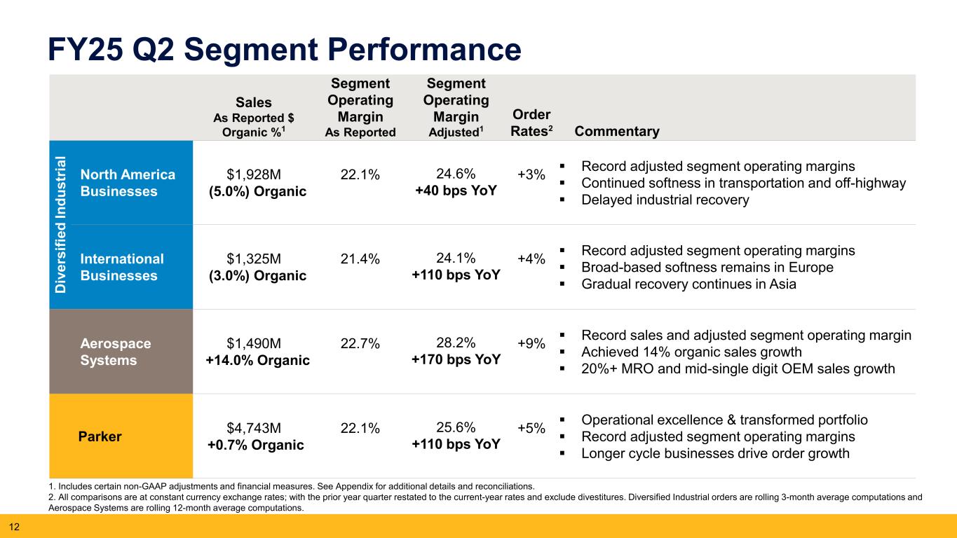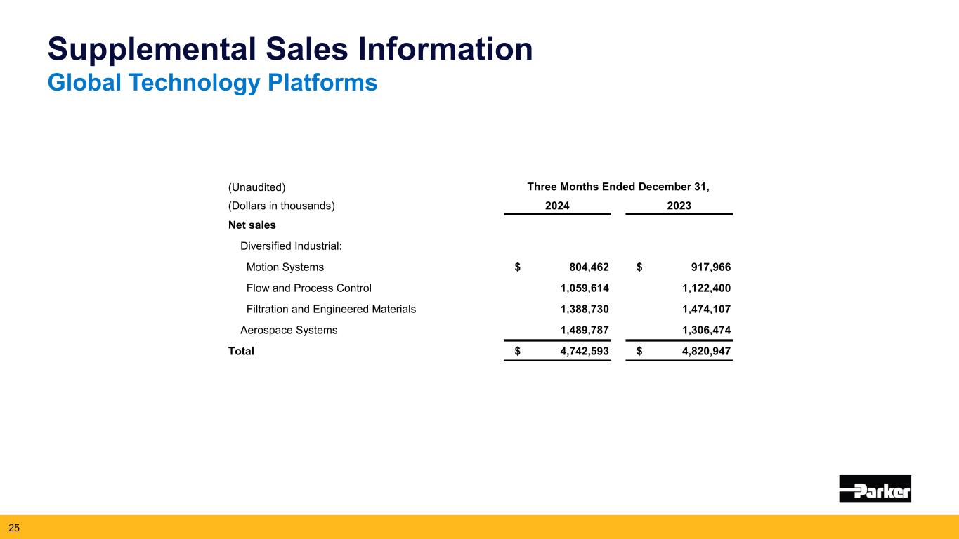 (Dollars in thousands) (Unaudited) Quarter-to-Date As Reported Adjusted As Reported Net Sales December 31, 2024 December 31, 2024 December 31, 2023 Diversified Industrial 3,252,806$ 46,362$ 67,385$ 3,366,553$ 3,514,473$ Aerospace Systems 1,489,787 (58) - 1,489,729 1,306,474 Total Parker Hannifin 4,742,593$ 46,304$ 67,385$ 4,856,282$ 4,820,947$ As reported Currency Divestitures Organic Diversified Industrial (7.4)% (1.3)% (1.9)% (4.2)% Aerospace Systems 14.0 % 0.0 % 0.0 % 14.0 % Total Parker Hannifin (1.6)% (0.9)% (1.4)% 0.7 % Supplemental Information: As Reported Adjusted As Reported Net Sales December 31, 2024 December 31, 2024 December 31, 2023 Diversified Industrial: North America businesses 1,928,008$ 8,913$ 67,385$ 2,004,306$ 2,110,203$ International businesses Europe 697,997 10,175 - 708,172 772,351 Asia Pacific 552,813 14,609 - 567,422 553,076 Latin America 73,988 12,665 - 86,653 78,843 International businesses 1,324,798$ 37,449$ -$ 1,362,247$ 1,404,270$ As reported Currency Divestitures Organic Diversified Industrial: North America businesses (8.6)% (0.4)% (3.2)% (5.0)% International businesses Europe (9.6)% (1.3)% 0.0 % (8.3)% Asia Pacific (0.0)% (2.6)% 0.0 % 2.6 % Latin America (6.2)% (16.1)% 0.0 % 9.9 % International businesses (5.7)% (2.7)% 0.0 % (3.0)% Currency Divestitures Currency Divestitures Reconciliation of Organic Growth 19