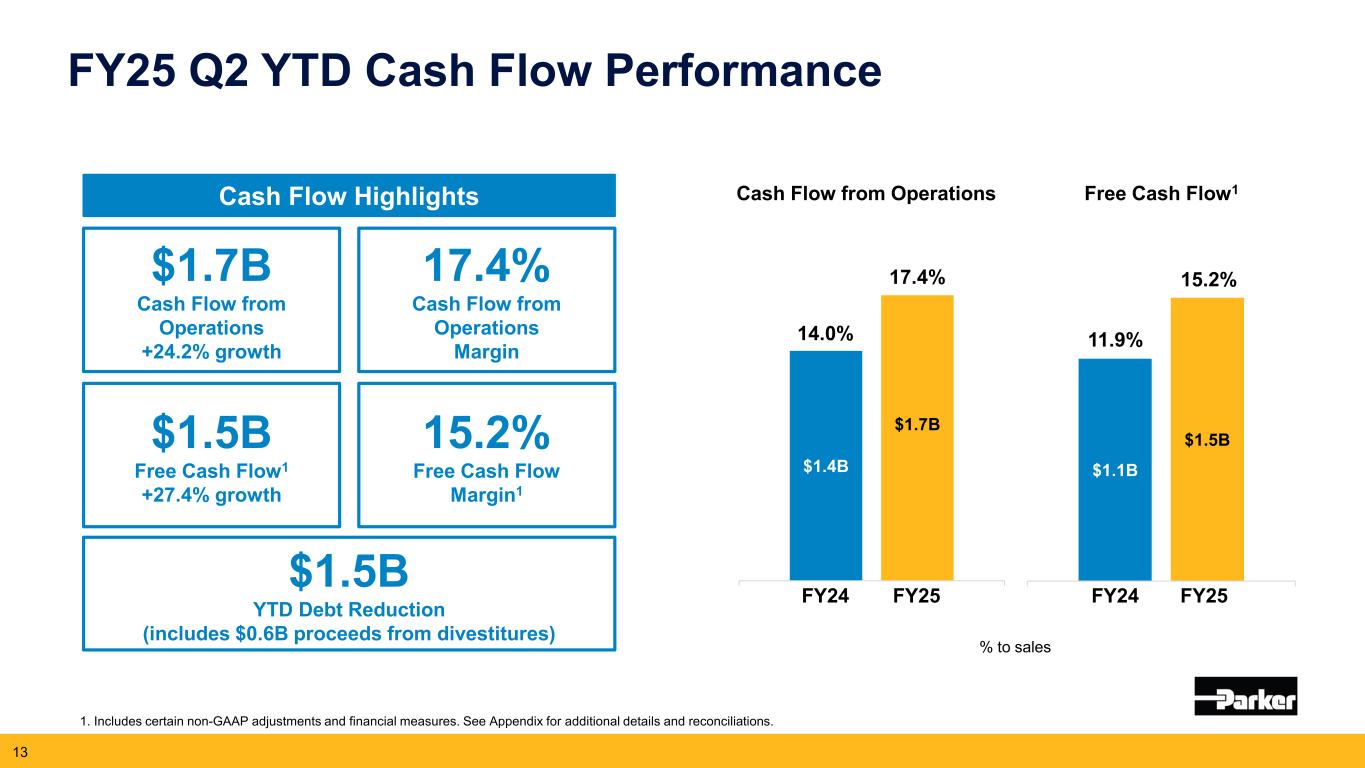 FY25 Q2 Segment Performance Sales As Reported $ Organic %1 Segment Operating Margin As Reported Segment Operating Margin Adjusted1 Order Rates2 Commentary D iv er si fie d In du st ria l North America Businesses $1,928M (5.0%) Organic 22.1% 24.6% +40 bps YoY +3% Record adjusted segment operating margins Continued softness in transportation and off-highway Delayed industrial recovery International Businesses $1,325M (3.0%) Organic 21.4% 24.1% +110 bps YoY +4% Record adjusted segment operating margins Broad-based softness remains in Europe Gradual recovery continues in Asia Aerospace Systems $1,490M +14.0% Organic 22.7% 28.2% +170 bps YoY +9% Record sales and adjusted segment operating margin Achieved 14% organic sales growth 20%+ MRO and mid-single digit OEM sales growth Parker $4,743M +0.7% Organic 22.1% 25.6% +110 bps YoY +5% Operational excellence & transformed portfolio Record adjusted segment operating margins Longer cycle businesses drive order growth 1. Includes certain non-GAAP adjustments and financial measures. See Appendix for additional details and reconciliations. 2. All comparisons are at constant currency exchange rates; with the prior year quarter restated to the current-year rates and exclude divestitures. Diversified Industrial orders are rolling 3-month average computations and Aerospace Systems are rolling 12-month average computations. 12