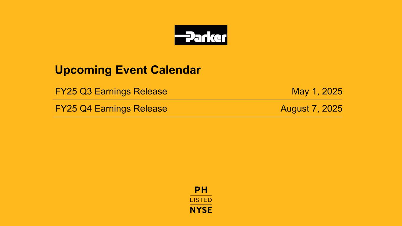 Forward-Looking Statements and Non-GAAP Financial Measures Forward-looking statements contained in this and other written and oral reports are made based on known events and circumstances at the time of release, and as such, are subject in the future to unforeseen uncertainties and risks. Often but not always, these statements may be identified from the use of forward-looking terminology such as “anticipates,” “believes,” “may,” “should,” “could,” “expects,” “targets,” “is likely,” “will,” or the negative of these terms and similar expressions, and may also include statements regarding future performance, orders, earnings projections, events or developments. Parker cautions readers not to place undue reliance on these statements. It is possible that the future performance may differ materially from expectations, including those based on past performance. Among other factors that may affect future performance are: changes in business relationships with and orders by or from major customers, suppliers or distributors, including delays or cancellations in shipments; disputes regarding contract terms, changes in contract costs and revenue estimates for new development programs; changes in product mix; ability to identify acceptable strategic acquisition targets; uncertainties surrounding timing, successful completion or integration of acquisitions and similar transactions; ability to successfully divest businesses planned for divestiture and realize the anticipated benefits of such divestitures; the determination and ability to successfully undertake business realignment activities and the expected costs, including cost savings, thereof; ability to implement successfully business and operating initiatives, including the timing, price and execution of share repurchases and other capital initiatives; availability, cost increases of or other limitations on our access to raw materials, component products and/or commodities if associated costs cannot be recovered in product pricing; ability to manage costs related to insurance and employee retirement and health care benefits; legal and regulatory developments and other government actions, including related to environmental protection, and associated compliance costs; supply chain and labor disruptions, including as a result of tariffs and labor shortages; threats associated with international conflicts and cybersecurity risks and risks associated with protecting our intellectual property; uncertainties surrounding the ultimate resolution of outstanding legal proceedings, including the outcome of any appeals; effects on market conditions, including sales and pricing, resulting from global reactions to U.S. trade policies; manufacturing activity, air travel trends, currency exchange rates, difficulties entering new markets and economic conditions such as inflation, deflation, interest rates and credit availability; inability to obtain, or meet conditions imposed for, required governmental and regulatory approvals; changes in the tax laws in the United States and foreign jurisdictions and judicial or regulatory interpretations thereof; and large scale disasters, such as floods, earthquakes, hurricanes, industrial accidents and pandemics. Readers should also consider forward-looking statements in light of risk factors discussed in Parker’s Annual Report on Form 10-K for the fiscal year ended June 30, 2024 and other periodic filings made with the SEC. This presentation contains references to non-GAAP financial information including adjusted net income, organic sales, adjusted earnings per share, adjusted segment operating margin for Parker and by segment, EBITDA, EBITDA margin, adjusted EBITDA, adjusted EBITDA margin, free cash flow, and free cash flow margin. As used in this presentation, EBITDA is defined as earnings before interest, taxes, depreciation and amortization. Adjusted EBITDA is defined as EBITDA before business realignment, integration costs to achieve, acquisition related expenses, and other one-time items. Free cash flow is defined as cash flow from operations less capital expenditures. Although adjusted net income, organic sales, adjusted earnings per share, adjusted segment operating margin for Parker and by segment, EBITDA, EBITDA margin, adjusted EBITDA, adjusted EBITDA margin, free cash flow, and free cash flow margin are not measures of performance calculated in accordance with GAAP, we believe that they are useful to an investor in evaluating the company performance for the periods presented. Detailed reconciliations of these non-GAAP financial measures to the comparable GAAP financial measures have been included in the appendix to this presentation. Please visit investors.parker.com for more information. 2